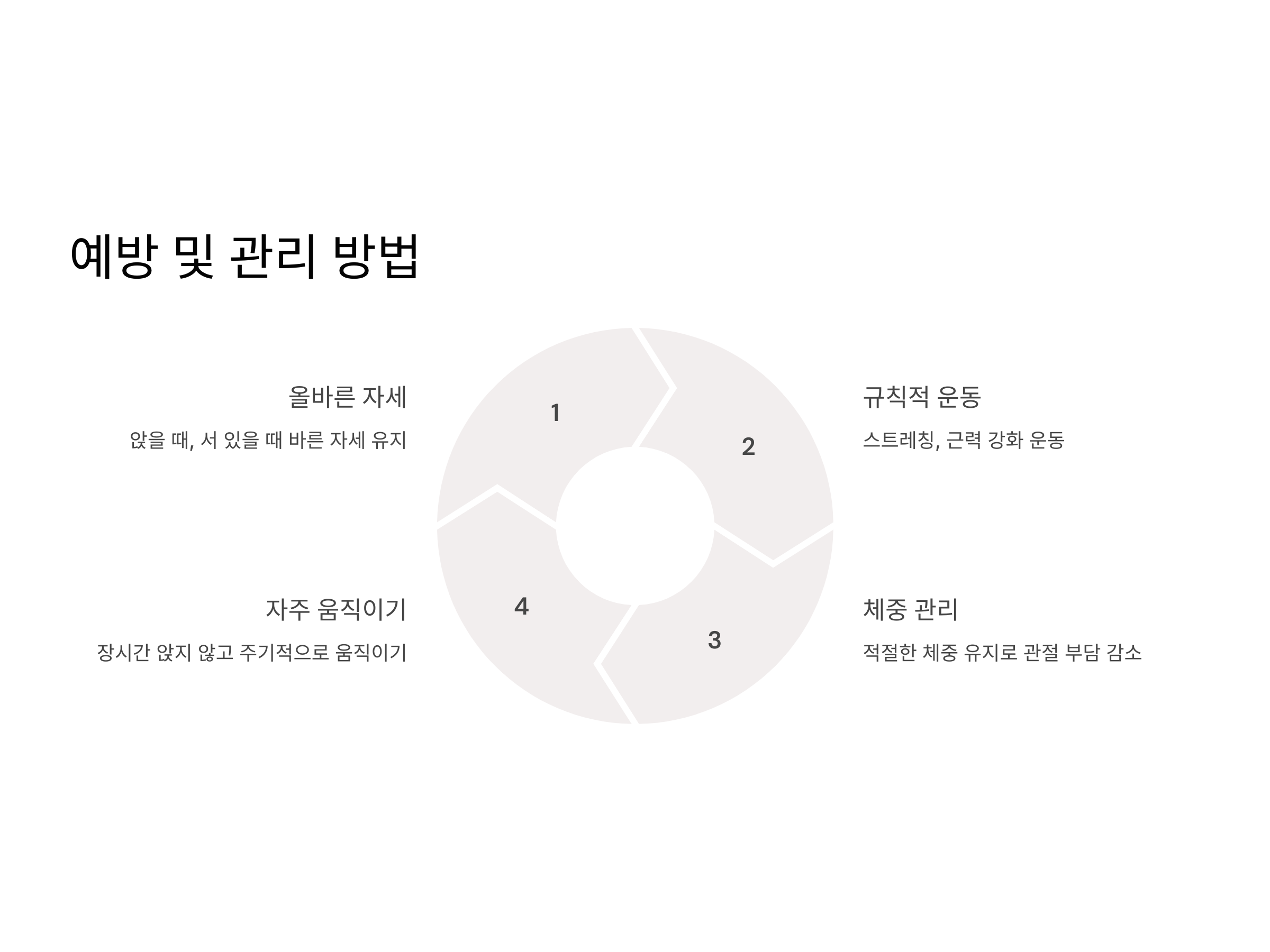 - 규칙적인 운동: 스트레칭과 근력 강화 운동