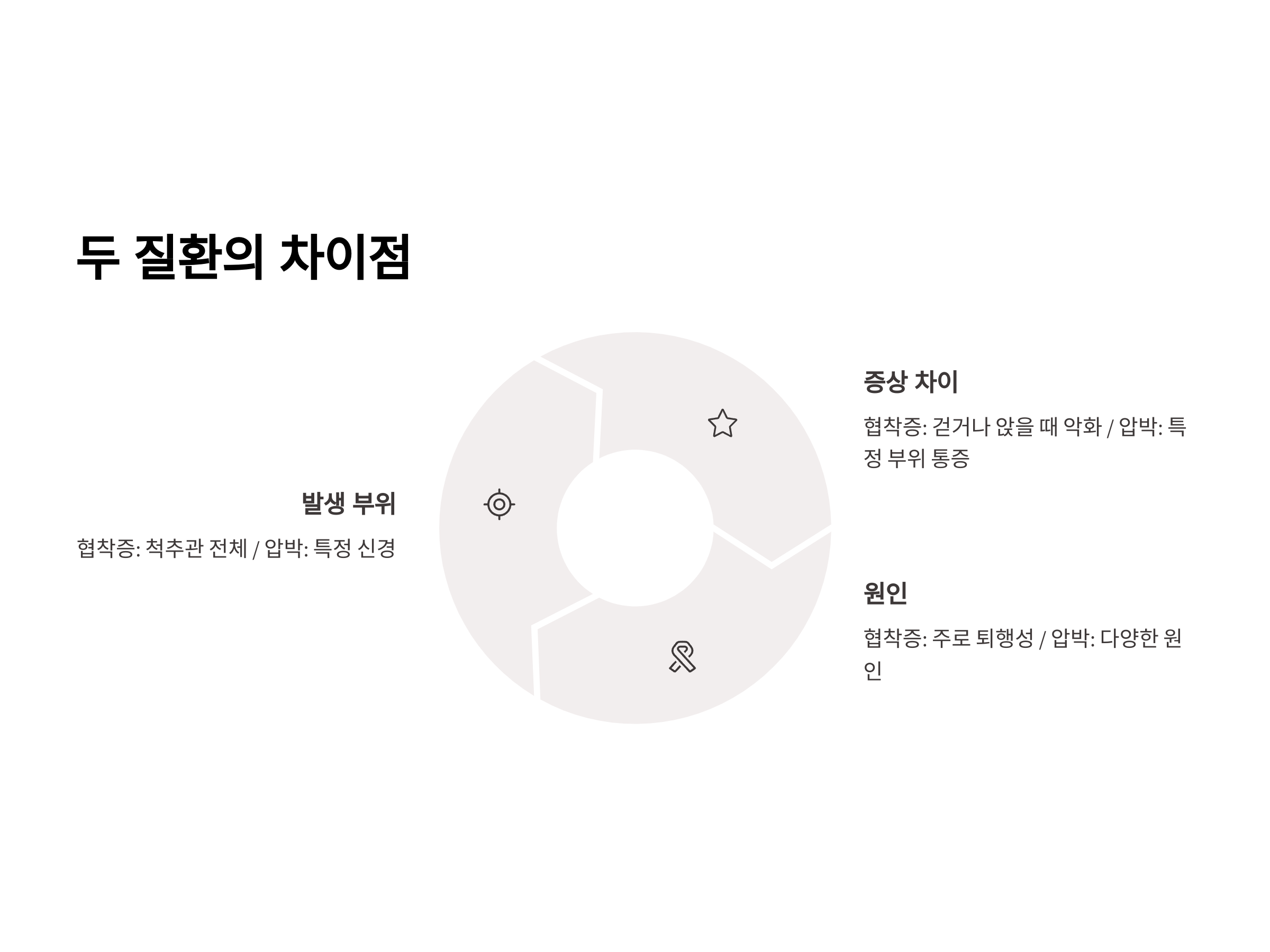 척추관 협착증은 주로 걸을 때나 앉을 때 통증이 악화되고, 다리나 허리까지 통증이 퍼질 수 있습니다. 반면 신경압박은 특정 부위에 집중적인 통증이 발생하는 경향이 있습니다.