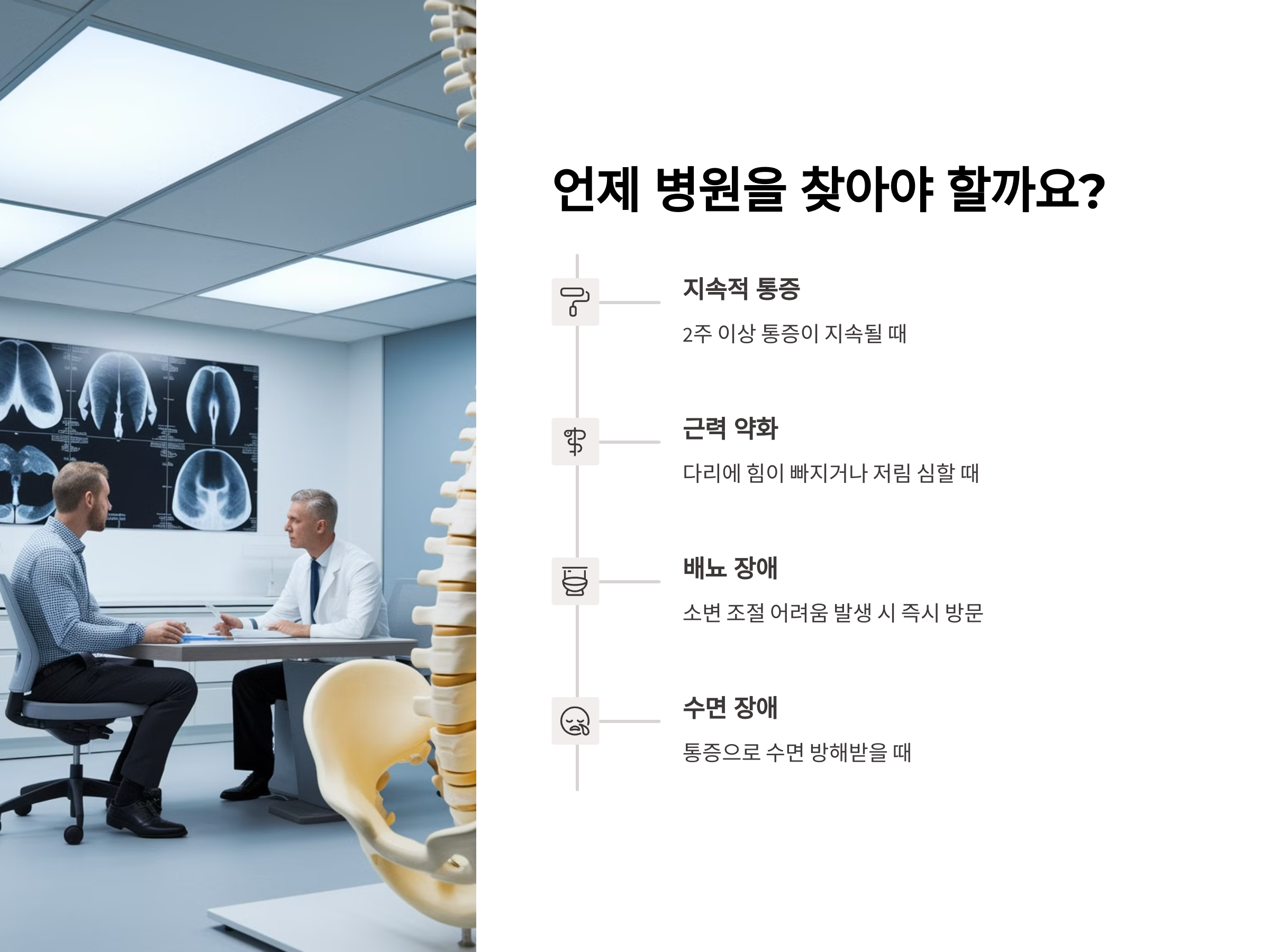 - 증상의 차이: 척추관 협착증은 걸을 때나 앉을 때 더 심해지는 경향이 있지만, 신경압박은 특정 부위에만 집중적인 통증이 나타날 수 있습니다.