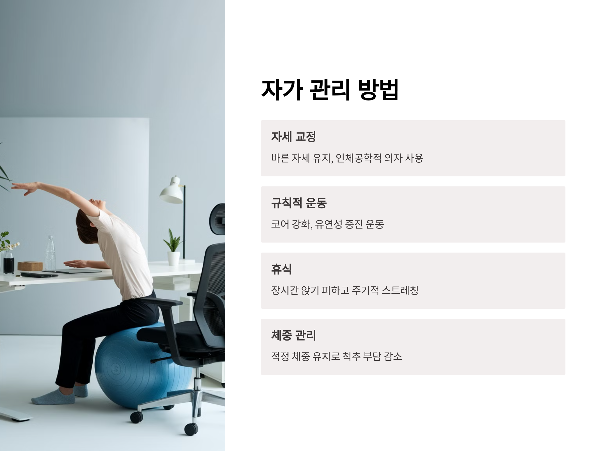 앉아 있을 때 통증이 심해진다면, 자세 교정이나 체중 분배에 신경을 써야 합니다. 또한, 앉을 때 무리하지 않도록 자주 일어나서 스트레칭을 해주는 것이 좋습니다.