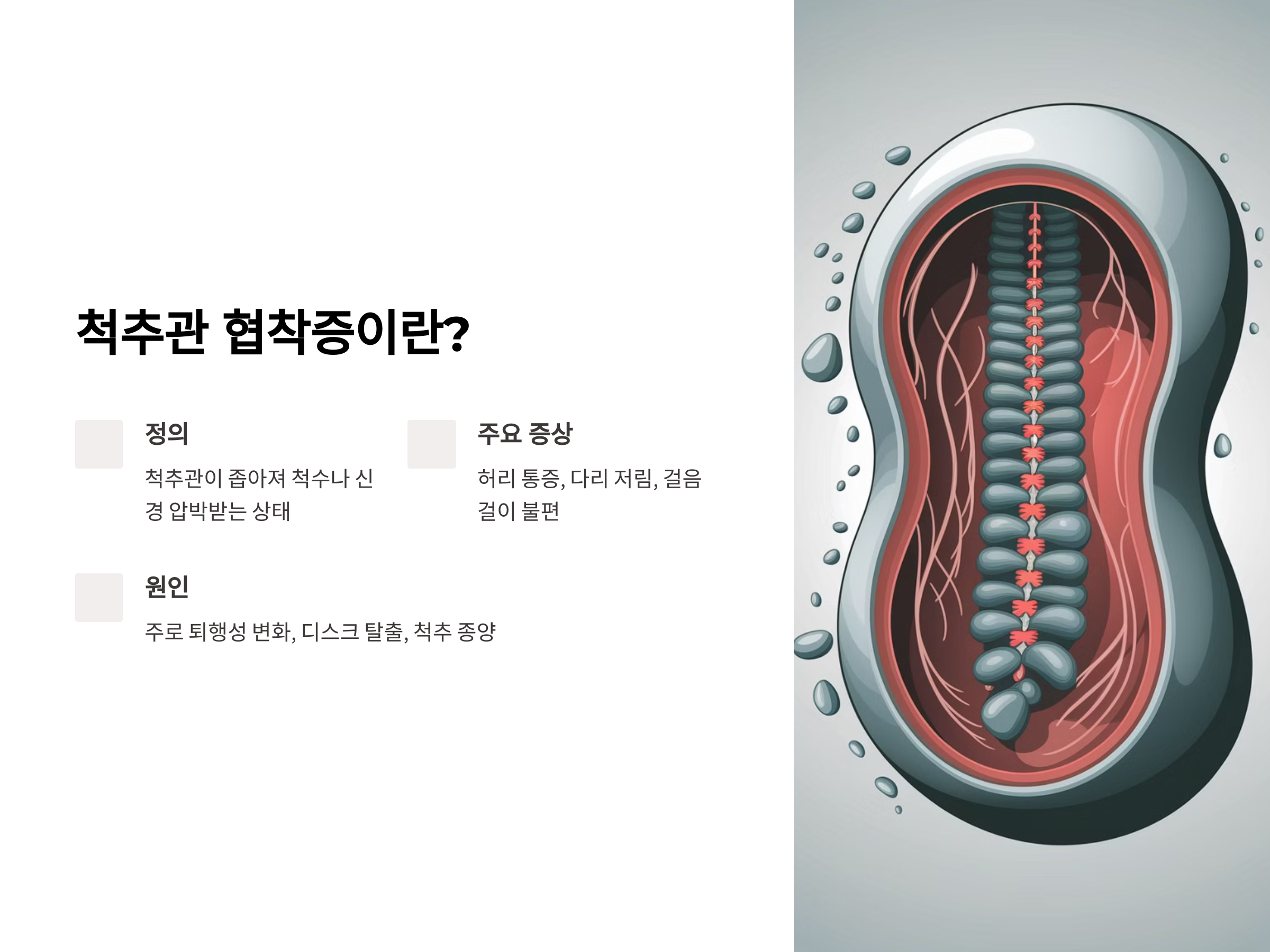 척추관 협착증은 척추관이 좁아져서 척수나 신경이 압박을 받는 상태를 말합니다. 척추관은 척추뼈와 그 사이에 위치한 디스크, 인대들이 형성하는 구멍으로, 그 안을 신경과 척수가 지나갑니다. 이 공간이 좁아지면 신경이 압박을 받아 통증이나 저림, 마비 등의 증상이 발생할 수 있습니다.