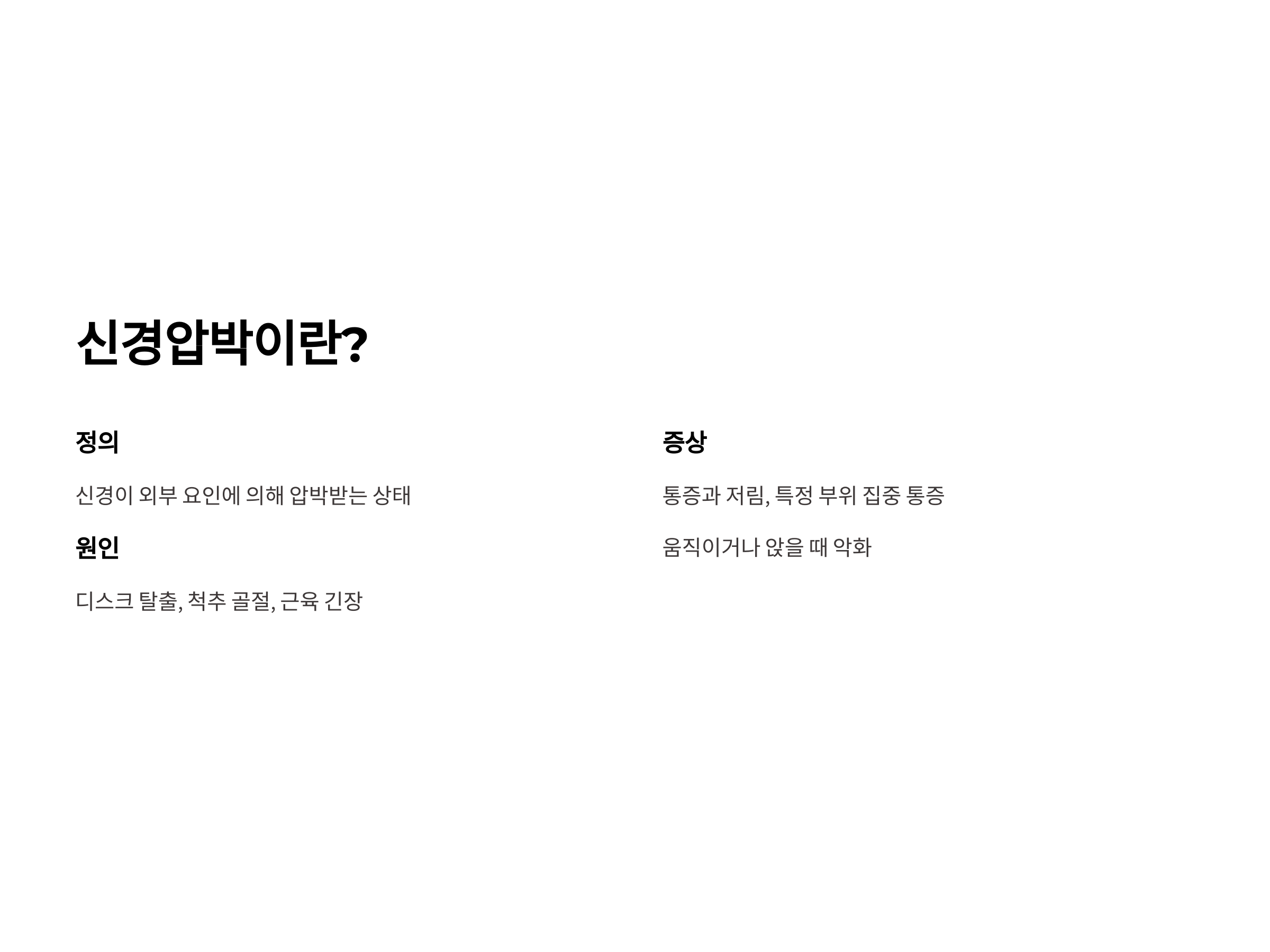 신경압박은 말 그대로 신경이 어떤 원인에 의해 압박을 받는 상태를 말합니다. 신경 압박은 디스크 탈출이나 척추 골절, 근육의 긴장 등 다양한 원인으로 발생할 수 있습니다. 압박을 받은 신경은 제대로 기능을 하지 못하게 되며, 그로 인해 저림, 통증, 마비 등의 증상을 유발할 수 있습니다.