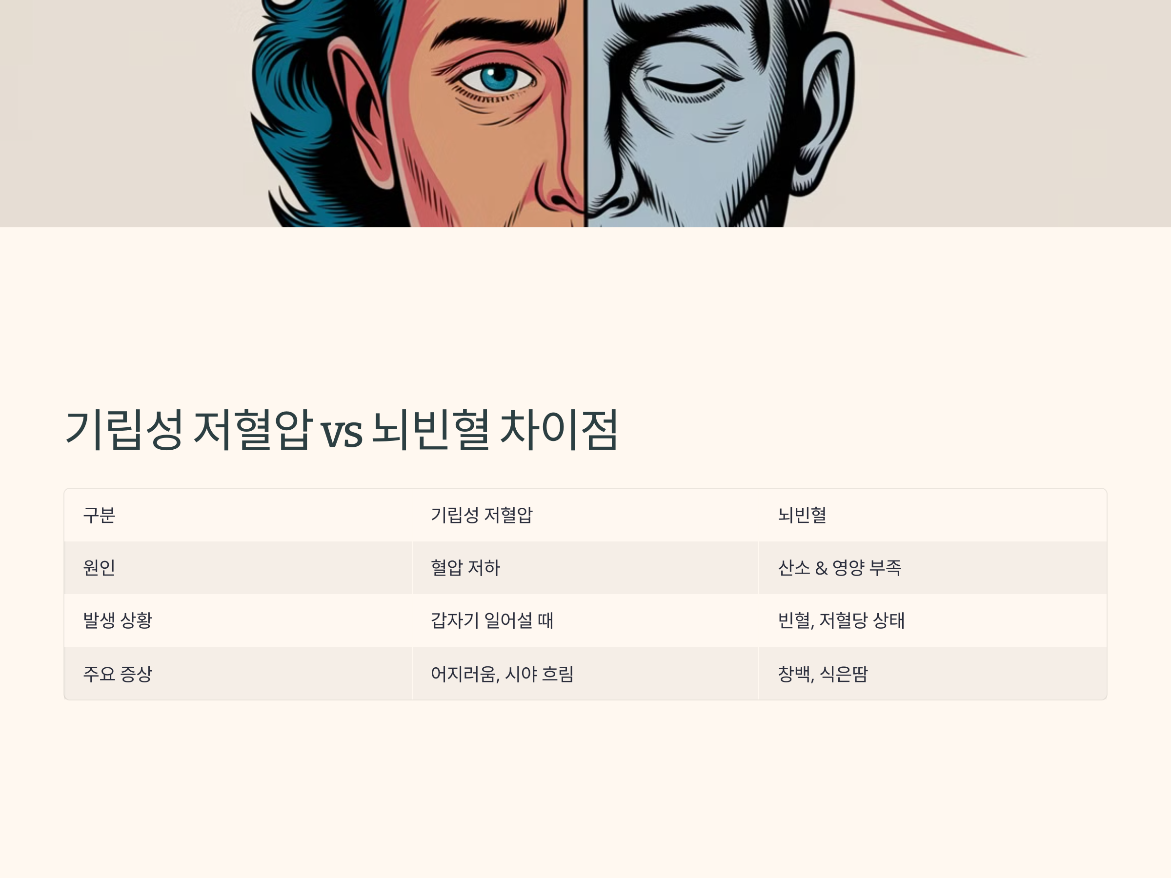 | 주요 증상 | 어지러움, 시야 흐림, 휘청거림 | 창백한 얼굴, 식은땀, 피로감 |