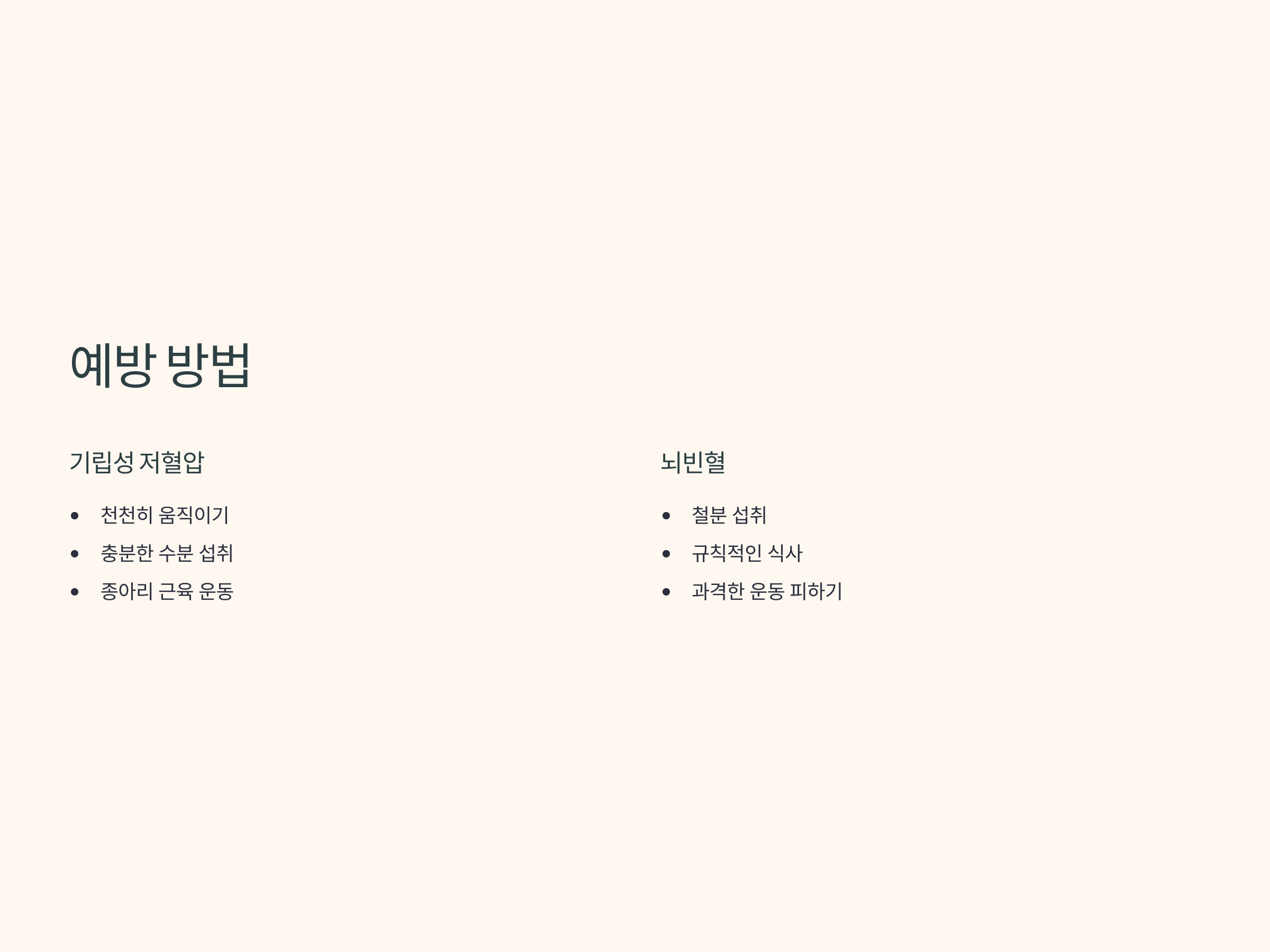 | 예방 방법 | 천천히 일어나기, 수분 & 염분 섭취 | 균형 잡힌 식사, 철분 보충 |