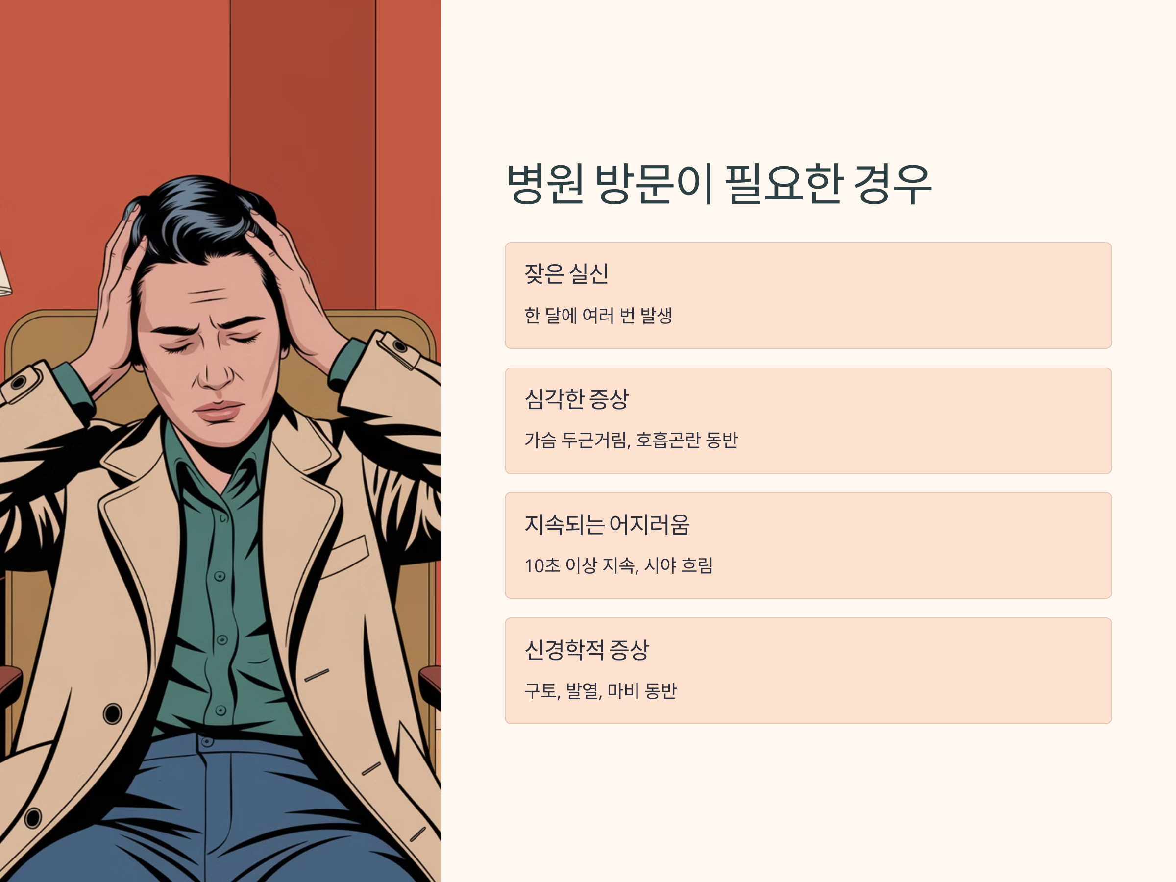 | 발생 상황 | 갑자기 일어설 때 | 빈혈, 저혈당 상태에서 발생 가능 |