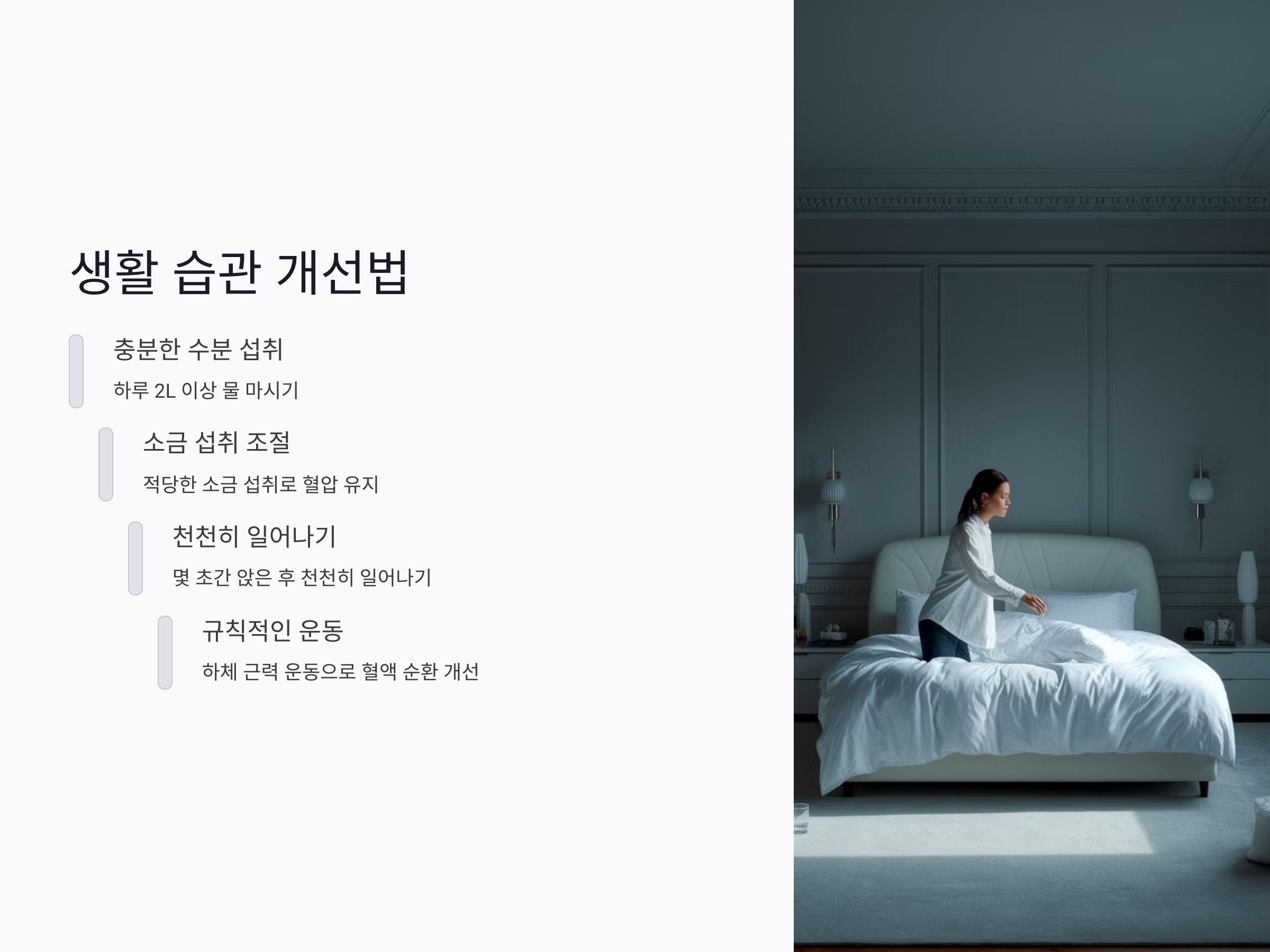 기립성 저혈압을 방치하면 뇌졸중, 심장 문제 등의 위험이 커질 수 있으므로 꾸준한 관리가 필요합니다. 이제 이를 예방하고 개선하는 방법을 알아보겠습니다.