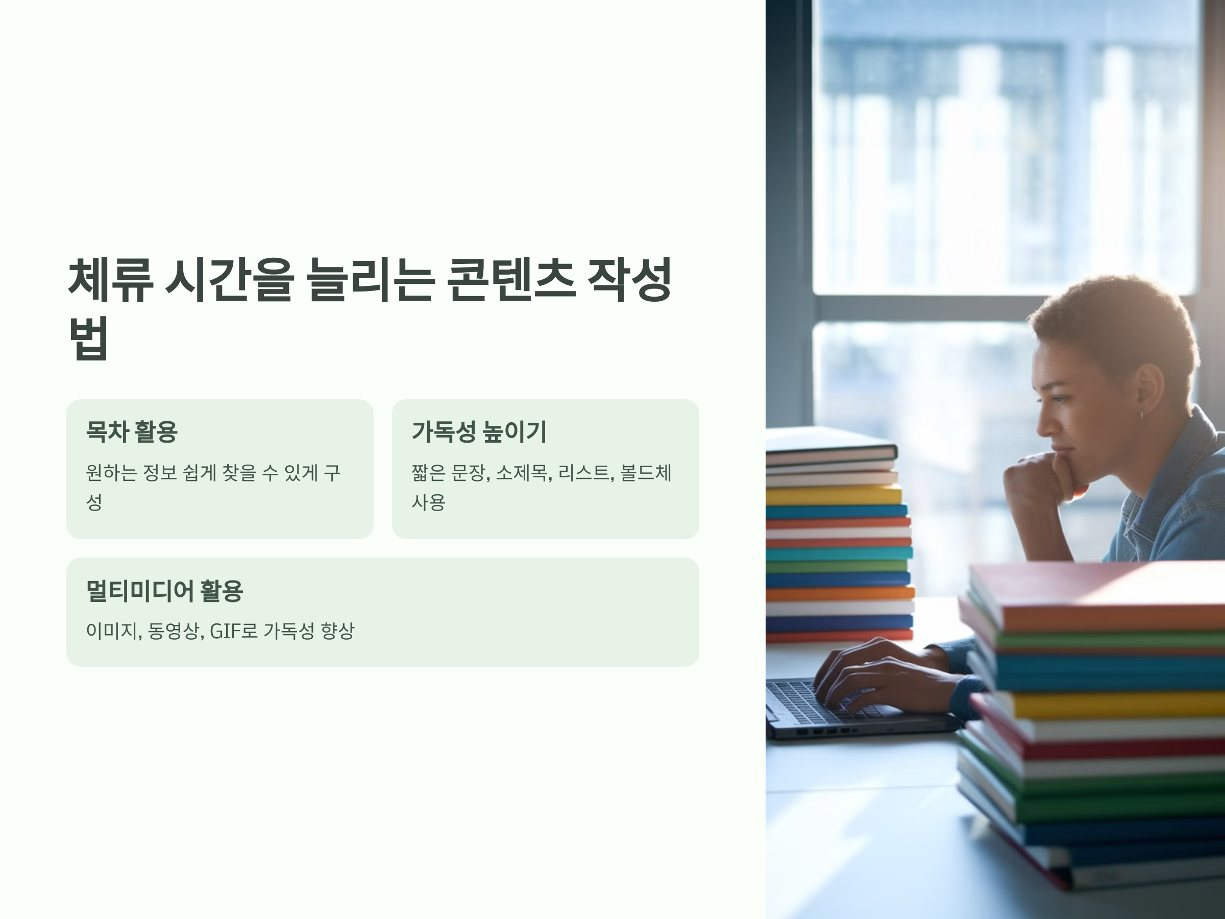방문자가 글을 읽다가 금방 나가버린다면 SEO 점수가 낮아지고, 검색 노출이 줄어듭니다. 체류 시간을 늘리는 콘텐츠 전략을 활용해야 합니다.