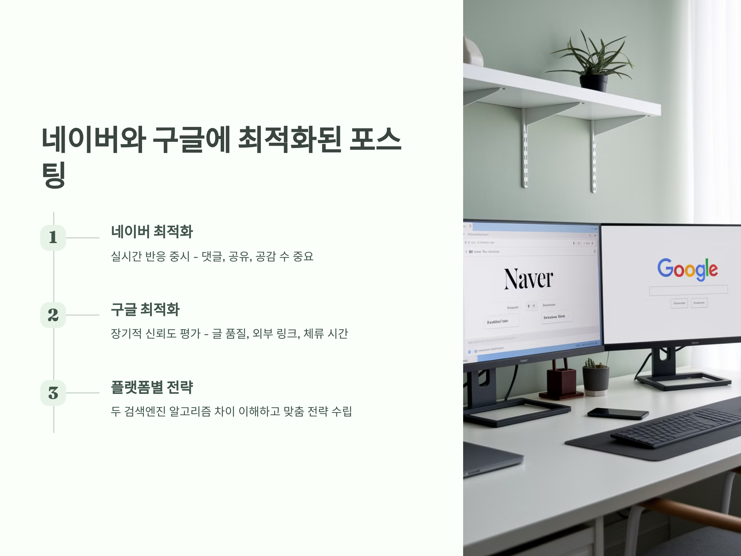네이버와 구글은 검색 알고리즘이 다릅니다. 두 플랫폼에 맞는 최적화 전략이 필요합니다.