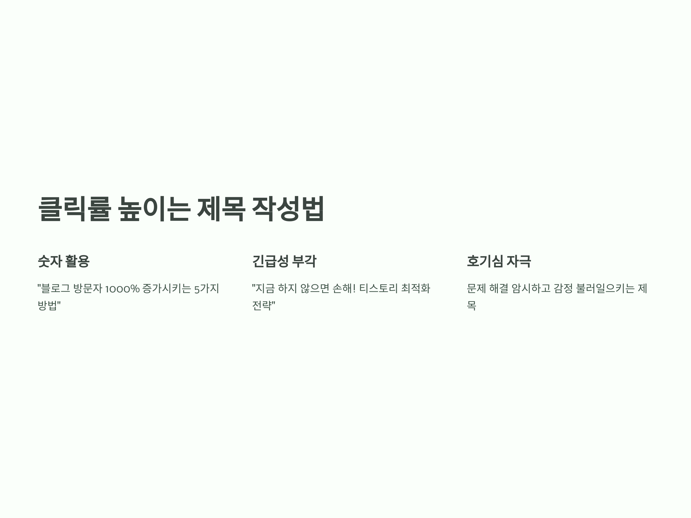 CTR이 높은 제목은 방문자 증가에 큰 영향을 줍니다. 제목은 호기심을 자극하고, 문제 해결을 암시하며, 감정을 불러일으켜야 합니다.
