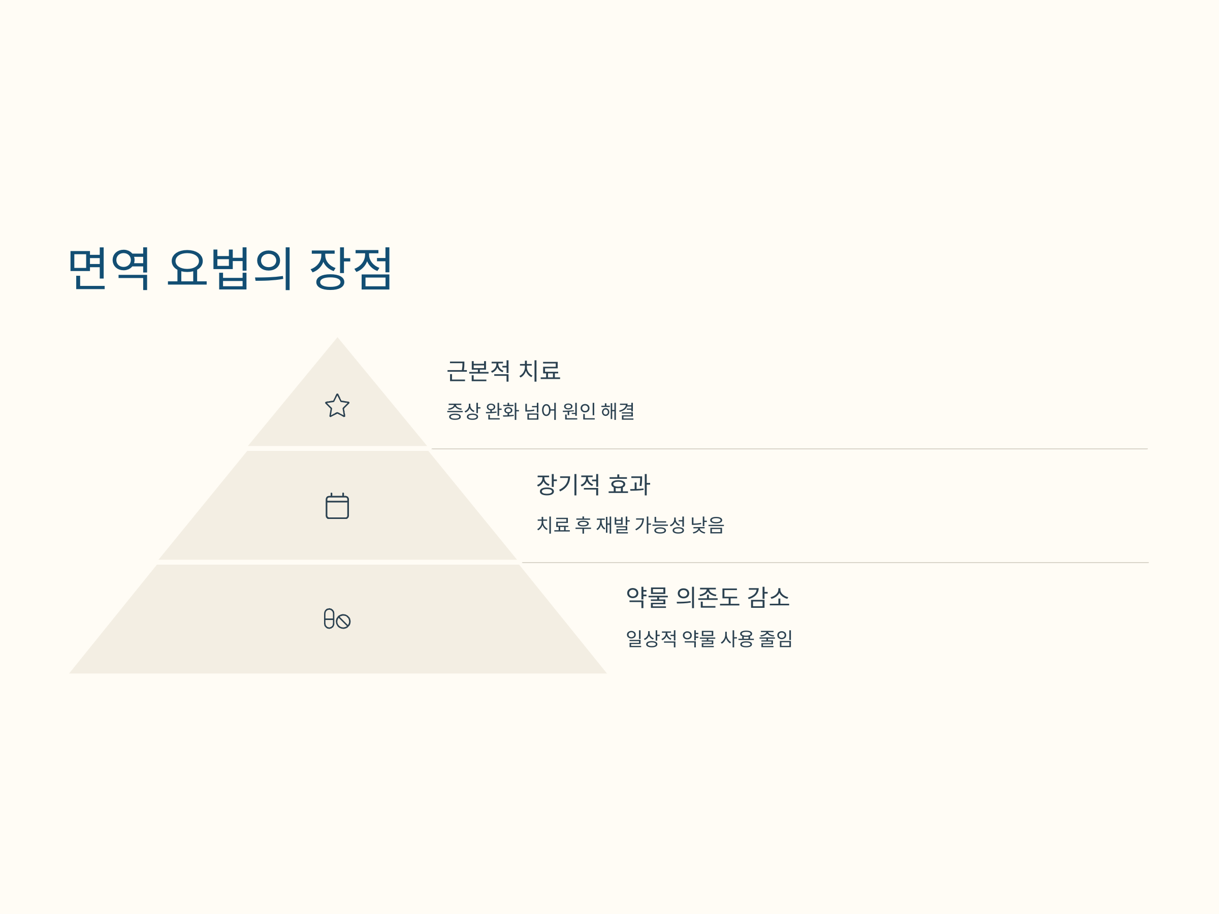 면역 요법은 초기에는 시간과 비용이 소요되는 치료이지만, 장기적으로 볼 때 알레르기 비염 증상을 근본적으로 개선하는 데 큰 도움이 됩니다. 또한, 일상적인 약물치료를 반복할 필요가 없으며, 증상의 재발을 방지하는 효과를 기대할 수 있습니다.