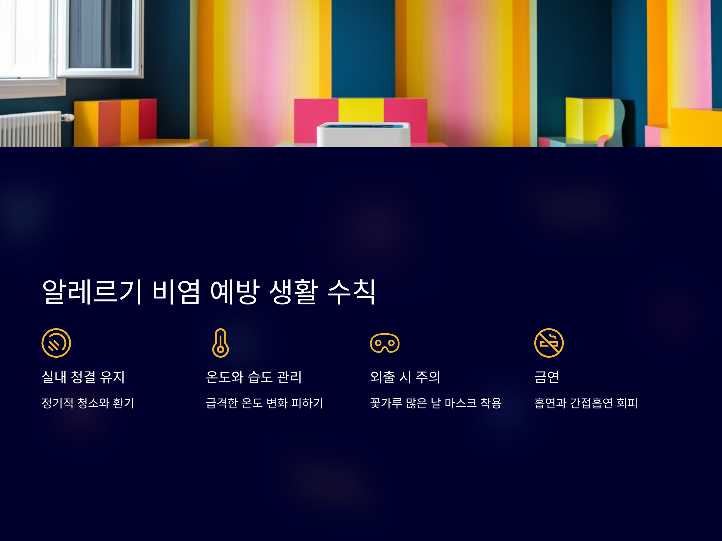 알레르기 비염을 예방하고 증상을 관리하기 위해서는 생활환경 개선이 중요합니다. 다음과 같은 수칙을 실천해보세요: