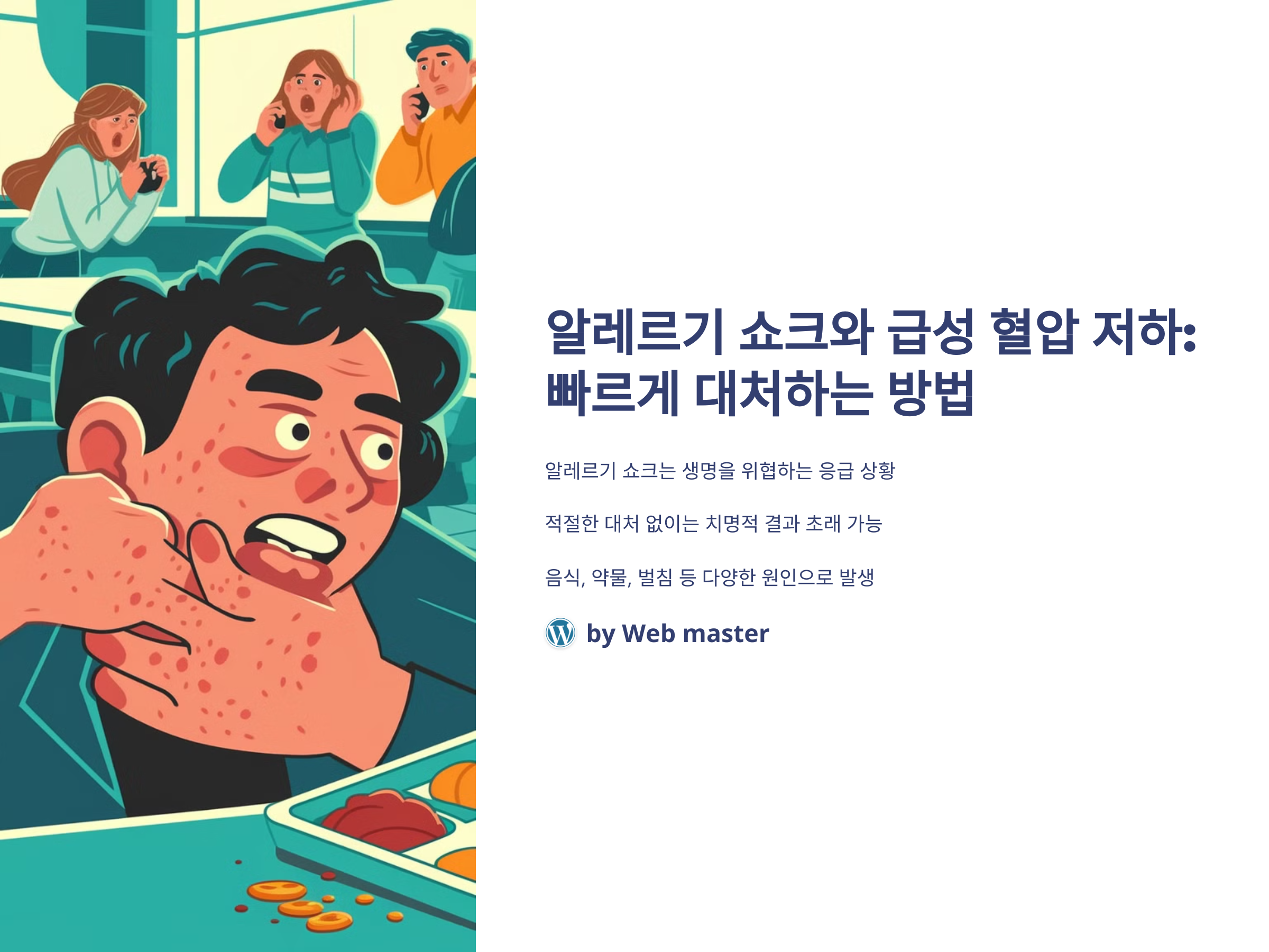 알레르기 쇼크는 알레르기 반응이 급격히 심각해져서 혈압이 급격히 떨어지는 상황을 말합니다. 이 상태는 생명을 위협할 수 있으며, 적절한 대처 없이는 치명적인 결과를 초래할 수 있습니다. 특히 음식, 약물, 벌침 등 다양한 원인에 의해 발생할 수 있는 알레르기 쇼크는 그 증상과 발병 속도가 빠르기 때문에 주의가 필요합니다. 이 글에서는 알레르기 쇼크의 원인, 급성 혈압 저하가 일어나는 이유, 증상, 대처 방법 등을 살펴보겠습니다.