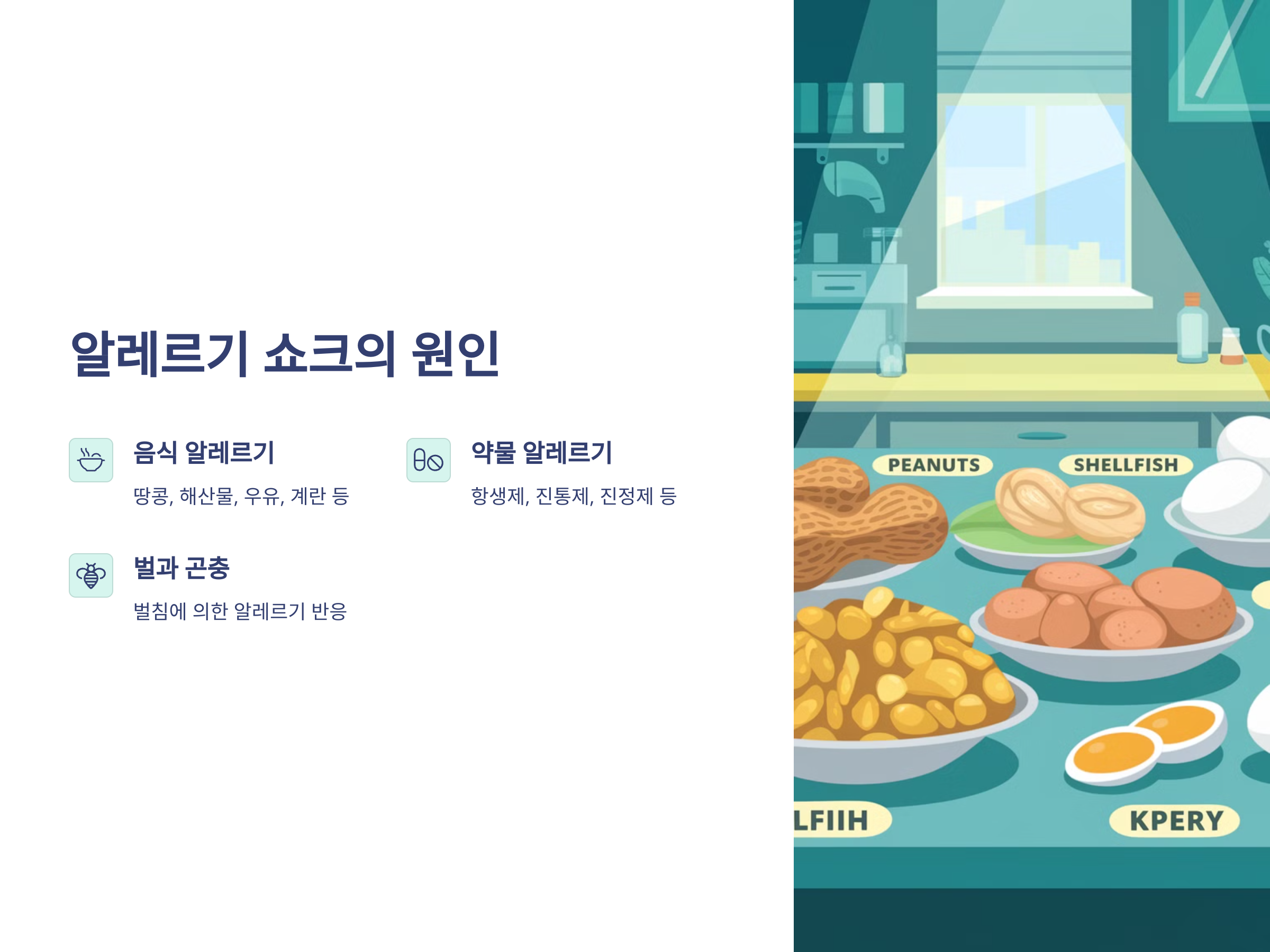 음식 알레르기의 경우, 땅콩, 해산물, 우유, 계란 등이 주요 원인입니다. 약물 알레르기는 항생제, 진통제, 진정제 등이 해당될 수 있습니다. 이러한 원인들로 인해 알레르기 반응이 급격히 일어나며, 혈액 순환에 영향을 미쳐 혈압이 급격히 떨어집니다. 이로 인해 의식을 잃거나 심각한 생리적 장애가 발생할 수 있습니다.