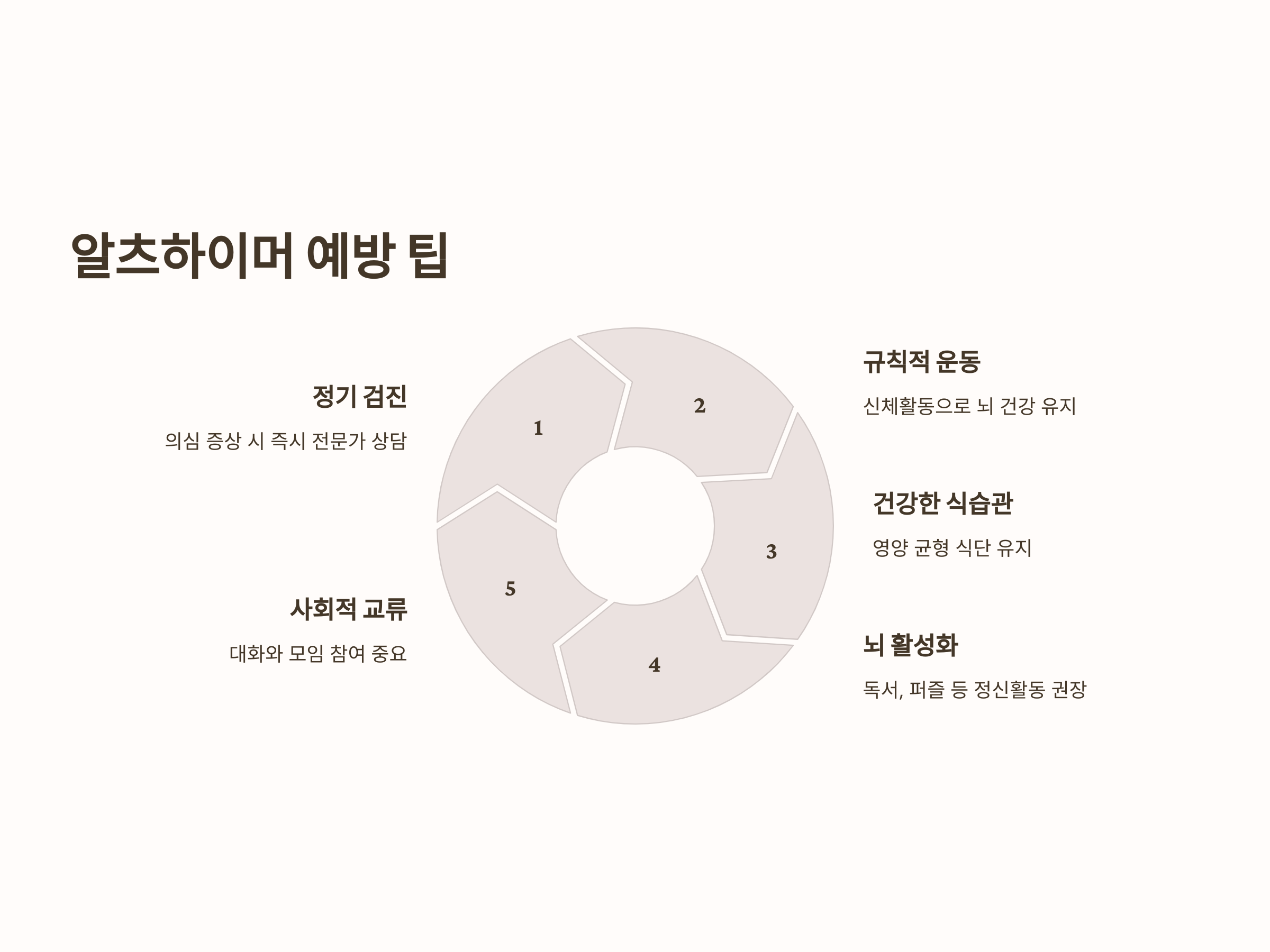 또한, 평소 뇌 건강을 유지하기 위해서는 규칙적인 운동과 건강한 식습관, 사회적 활동이 도움이 됩니다. 치매 예방을 위해 뇌를 자극하는 활동을 꾸준히 하는 것도 중요하며, 특히 기억력 훈련, 독서, 퍼즐 등은 뇌를 활성화하는 데 도움이 됩니다.