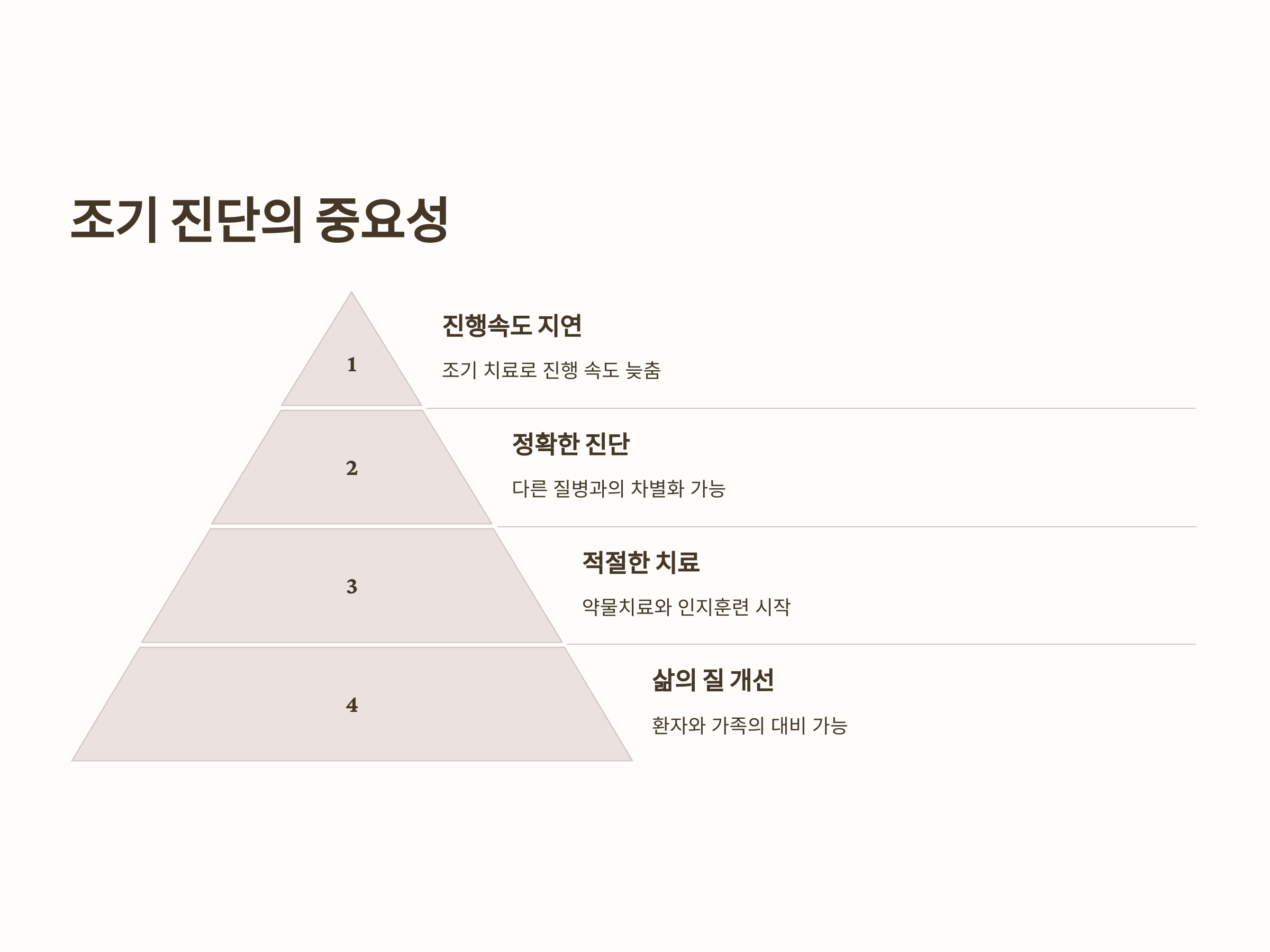 알츠하이머는 진행성이 매우 느린 질환입니다. 그러나 초기에 치료를 시작하면 그 진행 속도를 늦출 수 있는 가능성이 높습니다. 즉, 조기 진단이 매우 중요합니다. 알츠하이머는 기억력 저하 외에도 다양한 인지 능력의 저하가 함께 나타나기 때문에, 초기에는 혼동될 수 있는 다른 질병들과 차별화하는 것이 중요합니다.