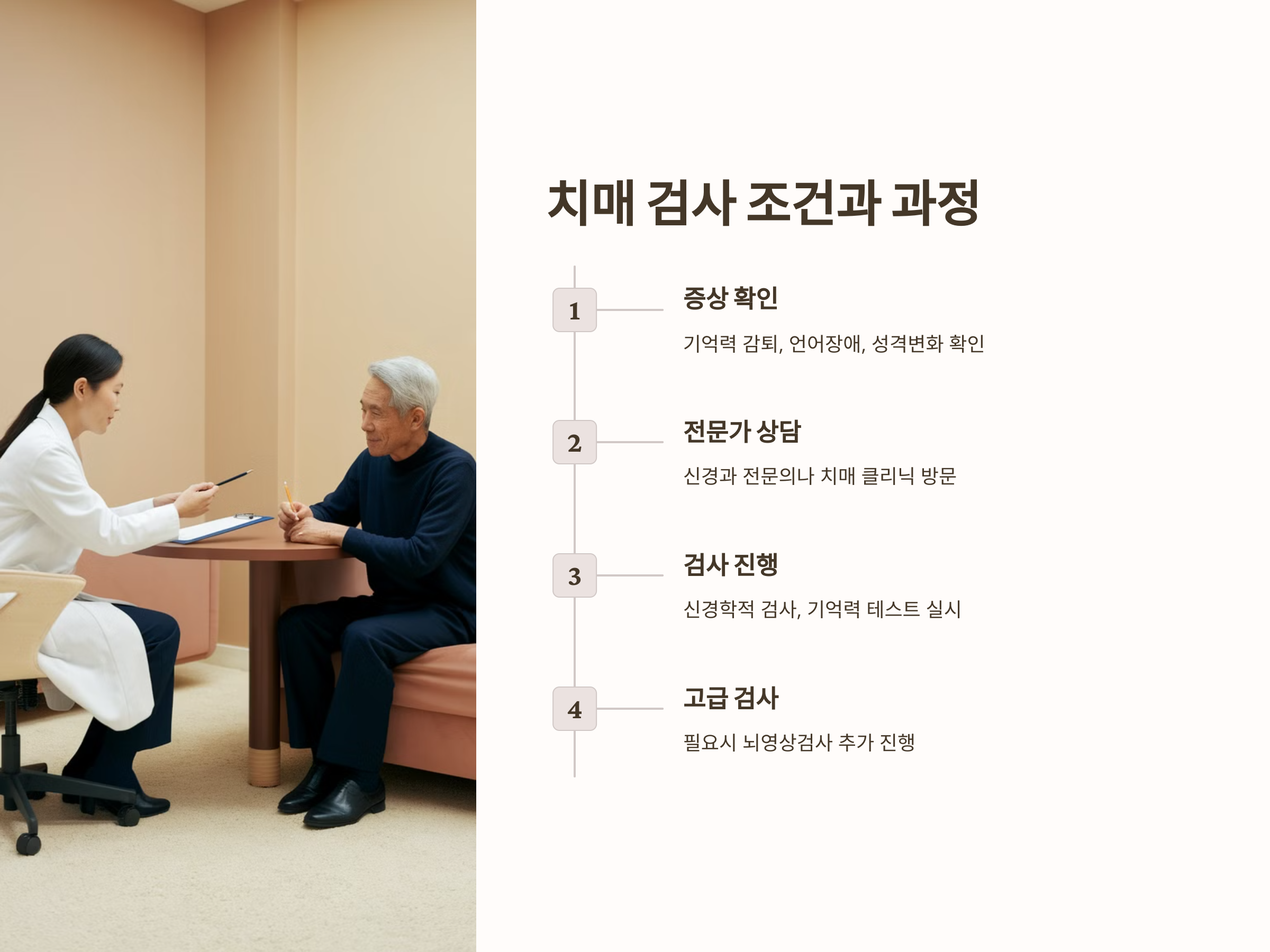 치매 검사를 받으려면 우선, 치매 의심 증상이 있어야 합니다. 치매의 초기 증상은 기억력 감퇴, 언어 장애, 성격 변화 등이 있으며, 이러한 증상이 있을 경우 전문가에게 상담을 받고 검사를 받는 것이 중요합니다. 특히, 알츠하이머는 서서히 진행되는 질병으로 초기에는 증상이 미미하여 조기 발견이 어렵습니다.