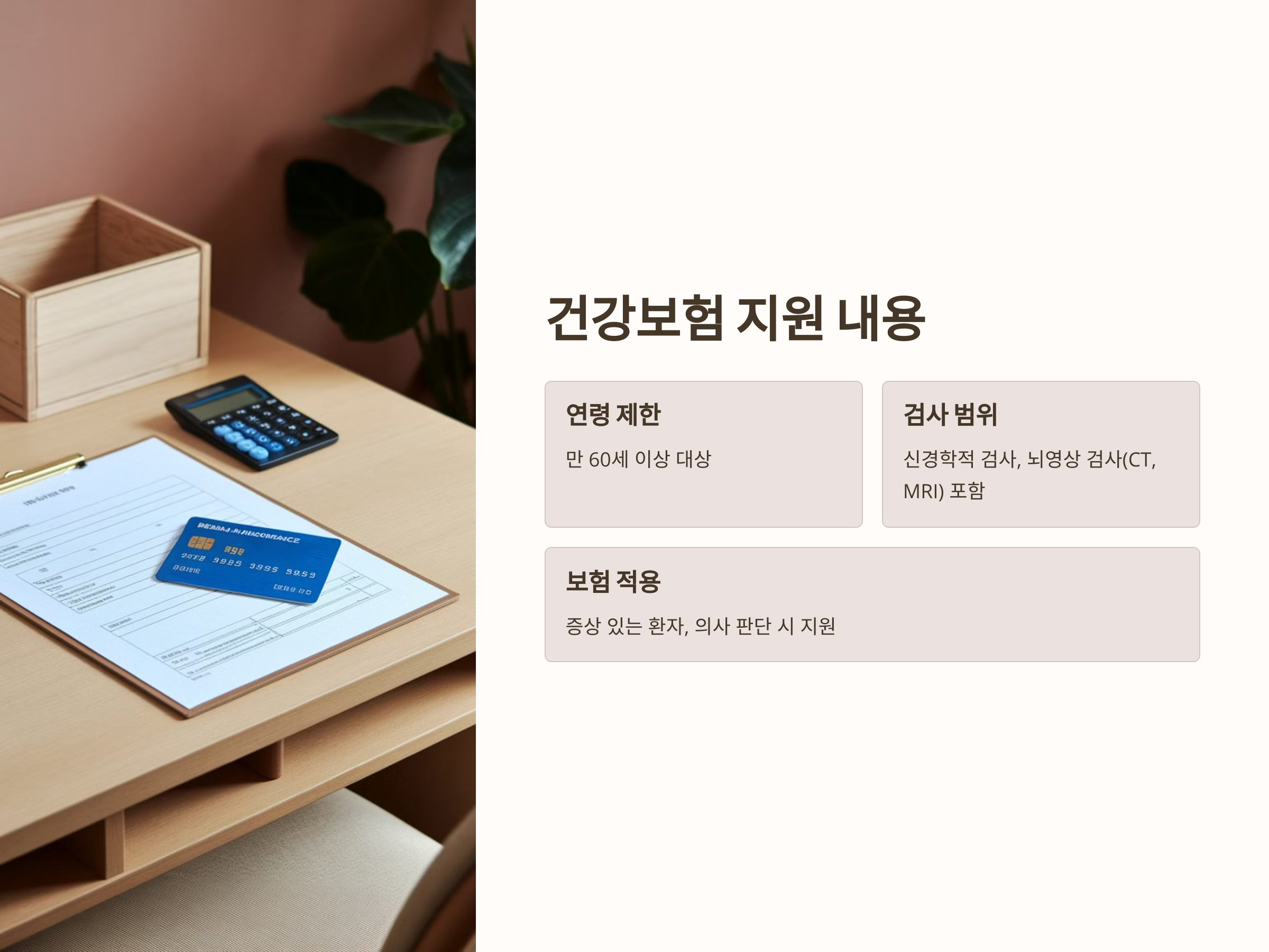 특히, 알츠하이머를 포함한 치매 검사에는 신경학적 검사, 뇌영상 검사(CT, MRI 등) 등이 포함될 수 있습니다. 이러한 검사는 의사의 판단에 따라 필요한 경우에만 진행됩니다. 이 경우에도 의사의 진단에 따라 건강보험이 지원됩니다. 또한, 최근에는 인지 기능 저하를 빠르게 확인할 수 있는 검사들이 개발되어 건강보험의 적용 범위도 점차 확대되고 있습니다.