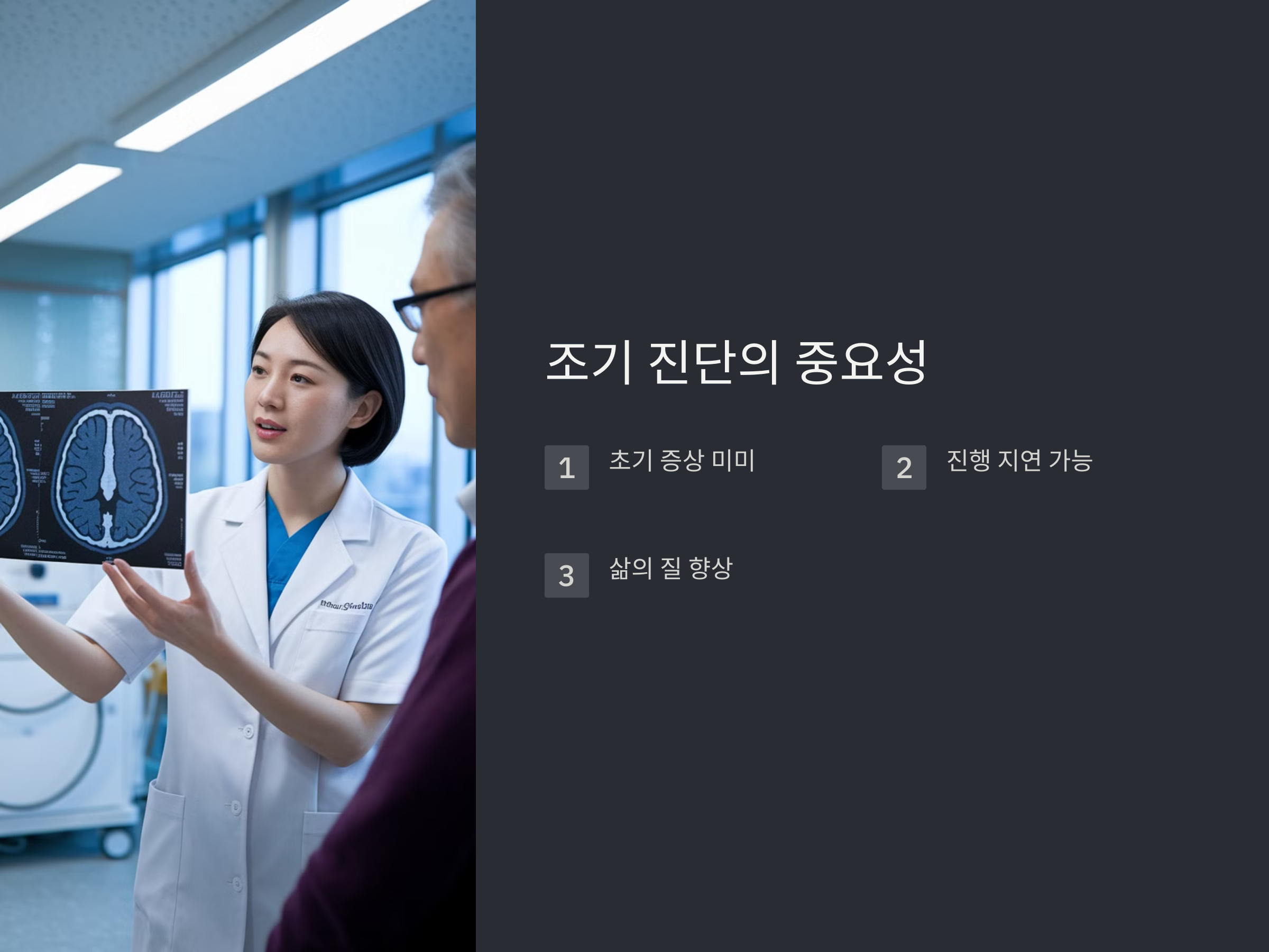 치매의 조기 진단은 단지 치료를 위한 것만이 아닙니다. 치매를 조기에 발견하면, 환자와 가족들이 이에 대비한 계획을 세울 수 있고, 사회적, 경제적 부담을 줄일 수 있습니다. 또한, 알츠하이머의 경우 증상이 심각해지기 전에 치료 방법을 찾으면 생활의 질을 크게 향상시킬 수 있습니다.