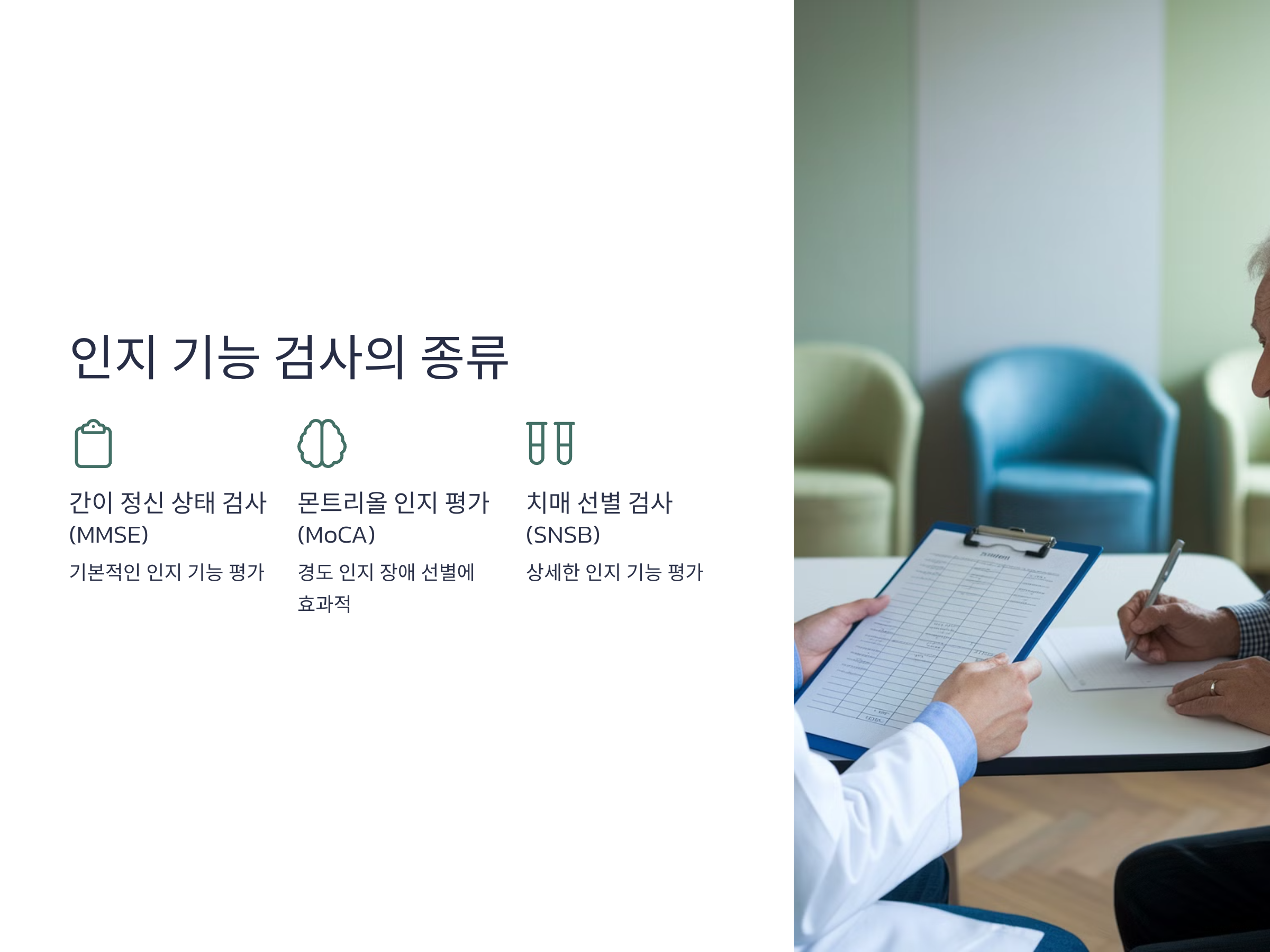 인지 기능 검사는 기억력, 주의력, 언어 능력, 시공간 능력 등을 평가하여 뇌 기능의 상태를 확인하는 검사입니다. 대표적인 검사로는 간이 정신 상태 검사(MMSE), 몬트리올 인지 평가(MoCA), 치매 선별 검사(SNSB) 등이 있습니다. 이러한 검사를 통해 인지 저하의 정도와 유형을 파악하여 알츠하이머병 여부를 진단하게 됩니다.