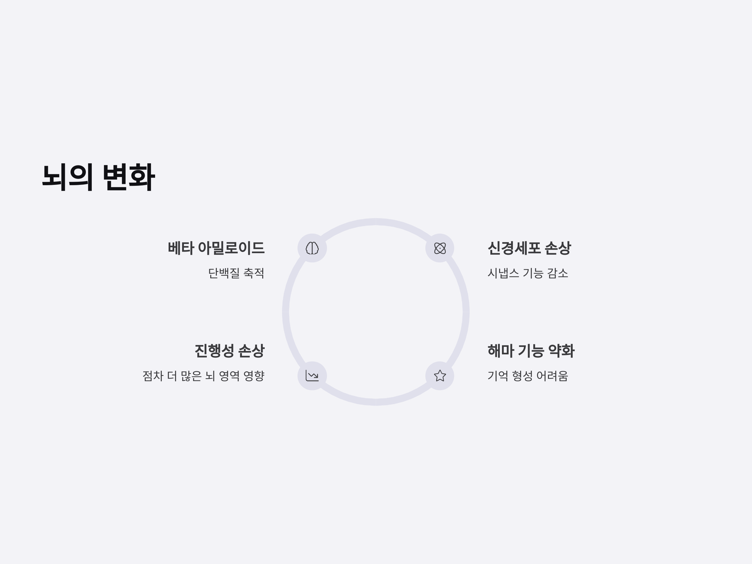 알츠하이머는 뇌의 신경 세포들이 손상되거나 죽어가면서 기억과 인지 기능이 점차적으로 약화되는 병입니다. 초기 단계에서는 주로 단기 기억에 문제가 발생하는데, 이는 최근에 일어난 일이나 대화 내용을 기억하는 데 어려움을 겪게 만듭니다. 그로 인해 환자는 반복해서 같은 질문을 하거나, 약속을 잊어버리거나, 일상적인 일을 잊고 혼란스러워할 수 있습니다.