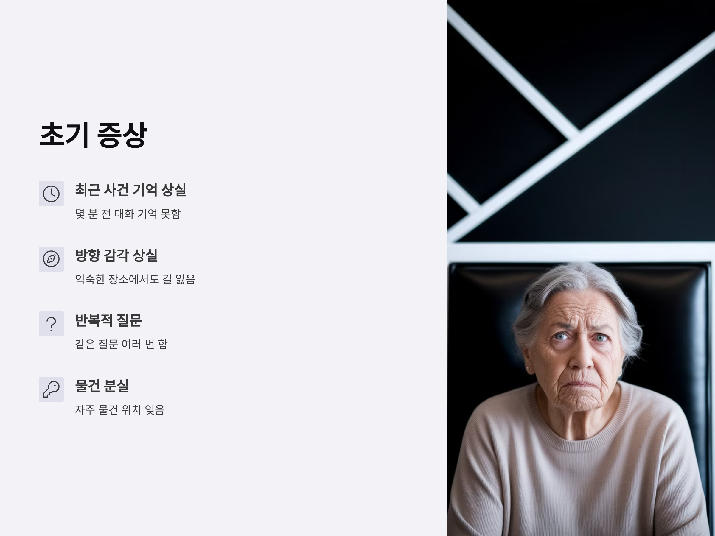 초기 증상은 보통 다른 인지 기능과 함께 나타날 수 있습니다. 예를 들어, 방향 감각을 잃거나, 물건을 자주 잃어버리거나, 일상적인 결정을 내리는 데 어려움을 겪는 등의 문제가 발생할 수 있습니다. 그러나 단기 기억 상실은 가장 뚜렷하게 나타나는 증상 중 하나로, 알츠하이머병의 초기 경고 신호일 수 있습니다.