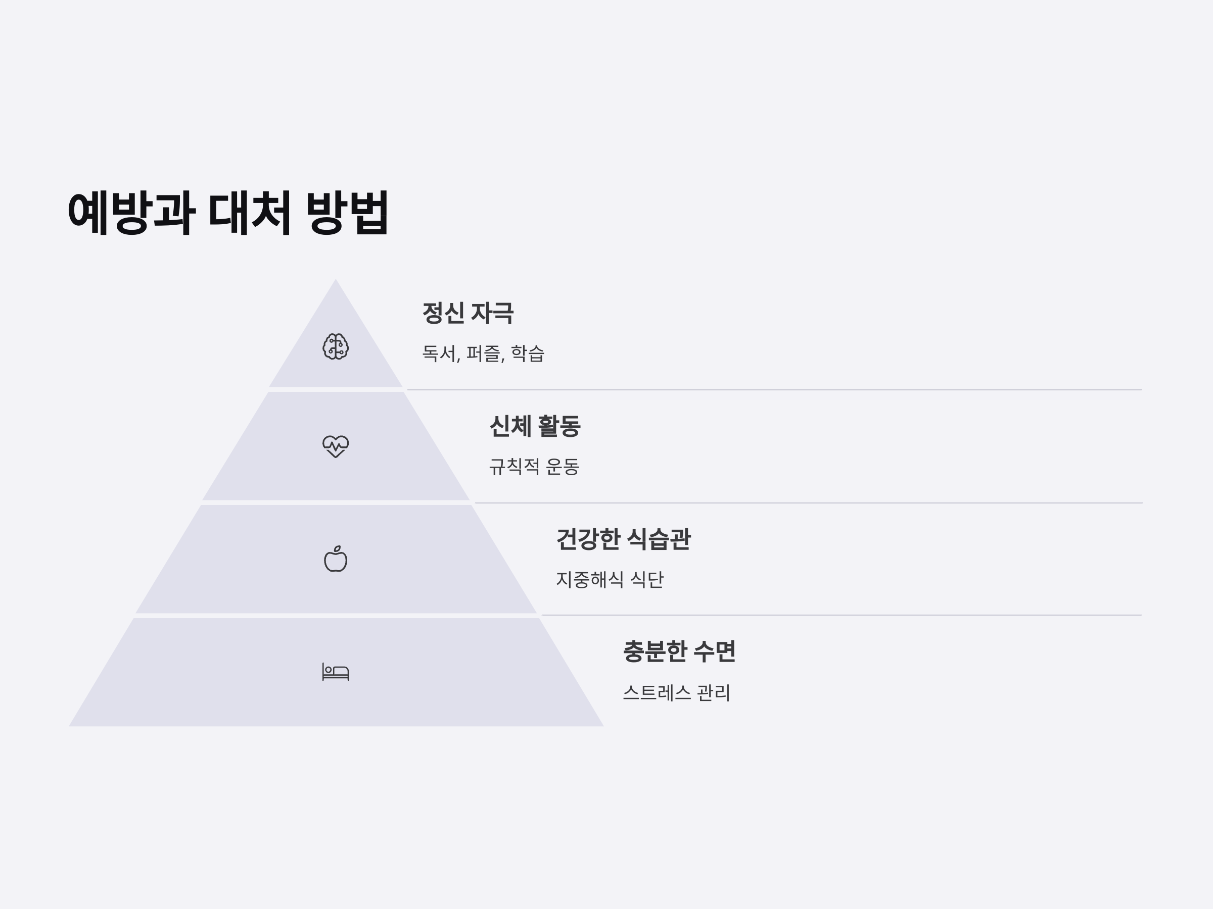 알츠하이머병은 예방이 어려운 질환으로 알려져 있지만, 몇 가지 생활 습관을 개선함으로써 그 진행을 늦출 수 있다는 연구 결과가 있습니다. 꾸준한 신체 활동, 건강한 식습관, 정신적인 자극을 주는 활동(독서, 퍼즐 등)을 통해 뇌 건강을 지키는 것이 중요합니다. 또한, 충분한 수면과 스트레스 관리 역시 뇌의 건강을 지키는 데 중요한 역할을 합니다.