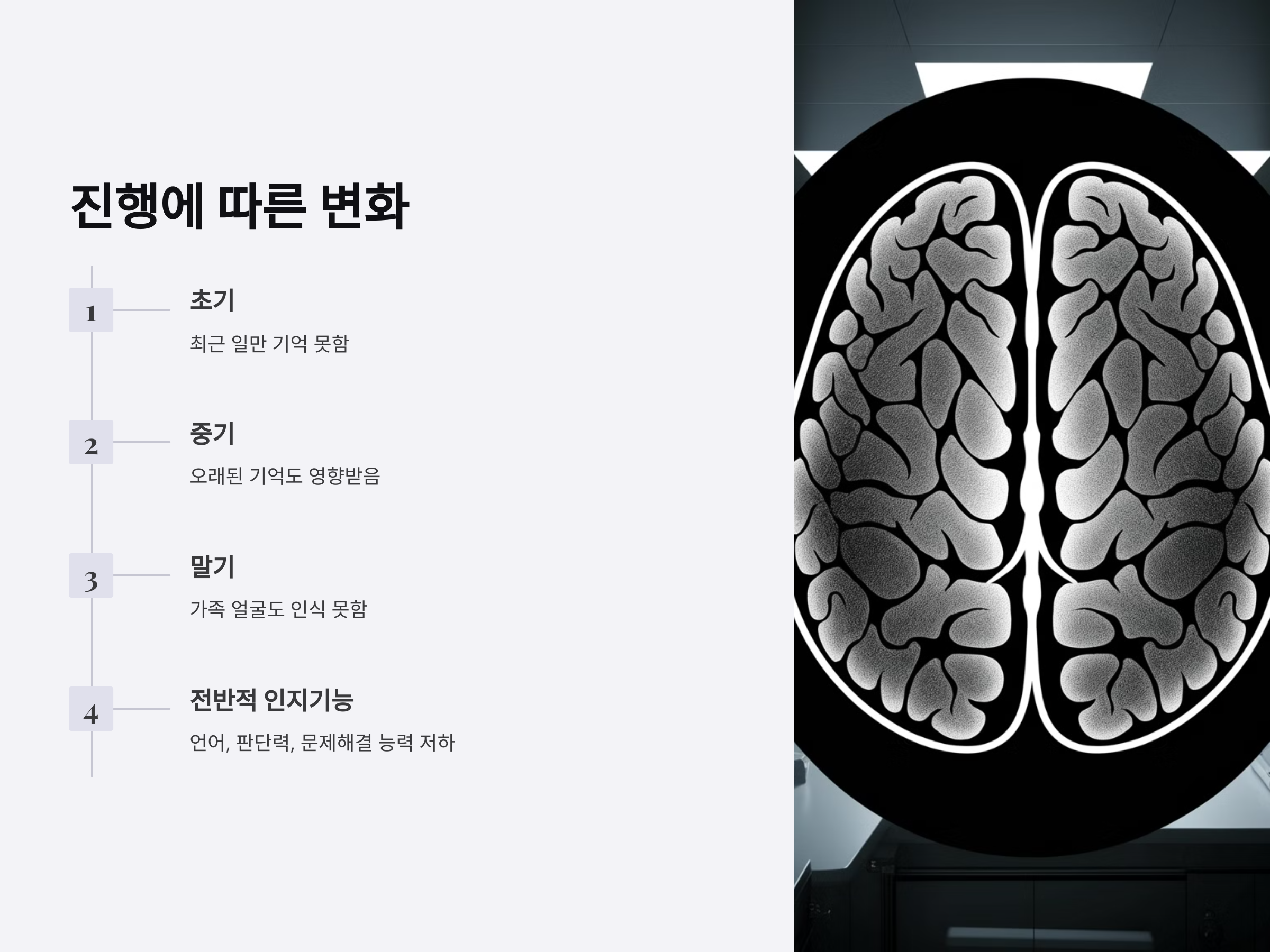 알츠하이머가 진행되는 동안 기억력뿐만 아니라 언어, 판단력, 문제 해결 능력 등 다른 인지 기능에도 영향을 미칩니다. 특히 단기 기억의 상실은 환자가 일상생활을 스스로 관리하는 데 큰 어려움을 초래할 수 있습니다. 그래서 초기 증상이 나타났을 때 가능한 빠르게 진단을 받고, 치료와 지원을 받는 것이 중요합니다.