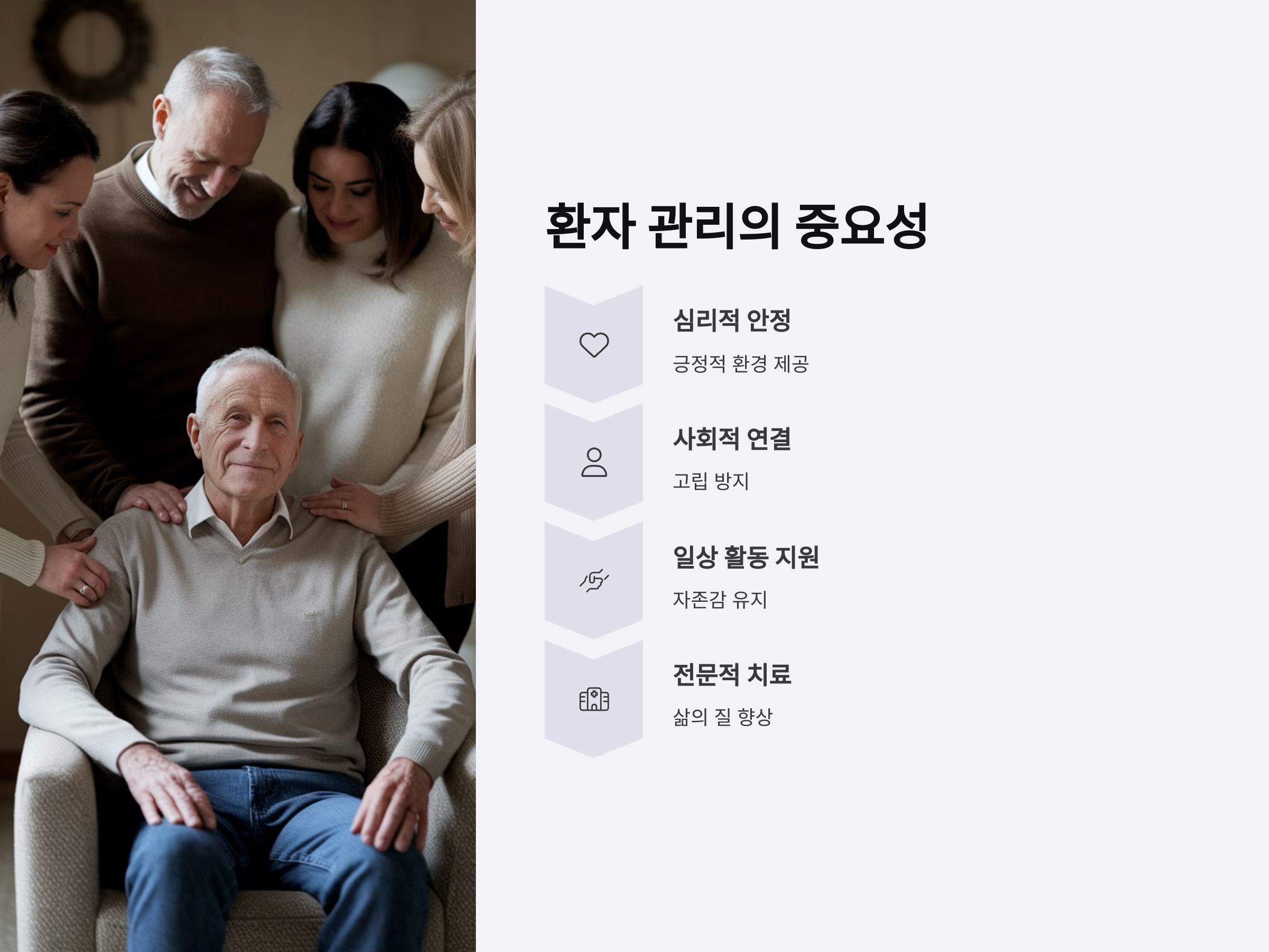 알츠하이머병 환자에게 가장 중요한 것은 초기부터 기억력 증진을 위한 관리가 이루어지는 것입니다. 단기 기억 상실은 환자의 자존감과 생활의 질에 큰 영향을 미칠 수 있기 때문에, 기억력을 보완할 수 있는 다양한 방법을 시도하는 것이 필요합니다. 예를 들어, 일상적인 일정을 기록하고 반복해서 확인하는 습관을 만드는 것이 도움이 될 수 있습니다. 또한, 환자와의 대화에서 중요한 정보는 다시 한 번 확인하거나 간단한 메모를 제공하는 것도 유효한 방법입니다.