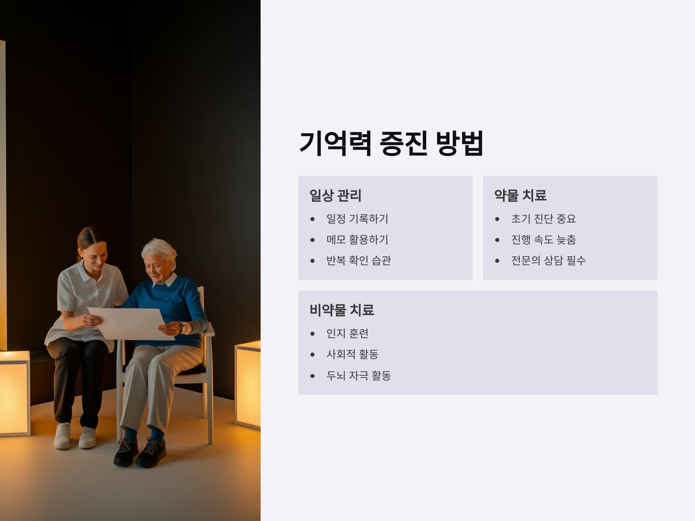 약물 치료나 비약물적 치료(인지 훈련, 사회적 활동 참여 등)도 기억력을 증진시키는 데 도움이 될 수 있습니다. 또한, 환자와 그 가족들은 알츠하이머병에 대한 정확한 이해를 통해 서로를 더 잘 지원할 수 있습니다. 이러한 방법들을 통해 알츠하이머의 진행을 늦추거나, 일상생활에서 보다 편안하게 대처할 수 있는 방법을 모색해야 합니다.
