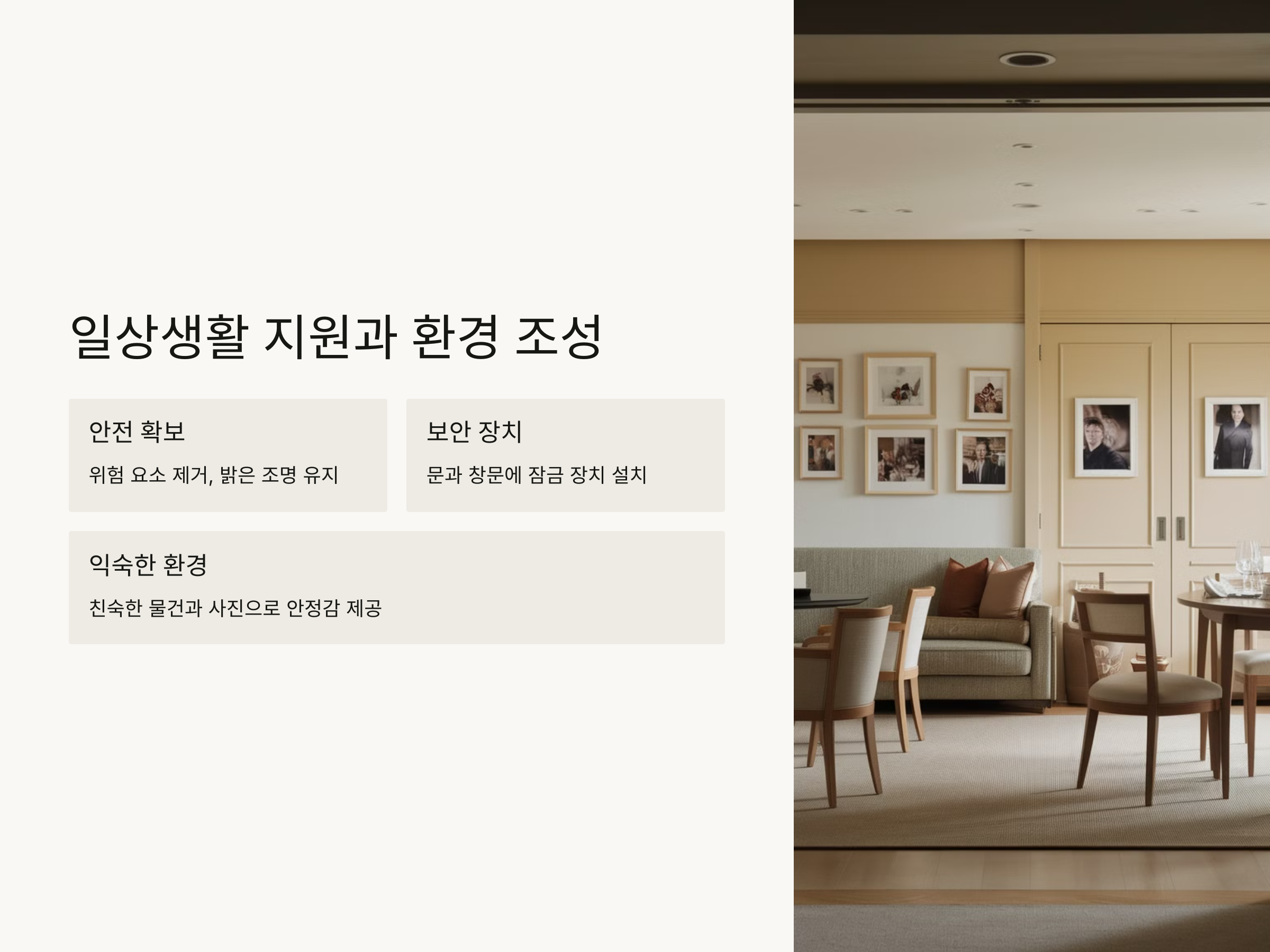 환자의 안전과 편안함을 위해 가정 내 환경을 조정하는 것이 필요합니다. 날카로운 물건이나 위험 요소를 제거하고, 집안의 조명을 밝게 유지하며, 문이나 창문에 잠금 장치를 설치하는 등의 조치가 필요합니다. 또한, 환자가 익숙한 물건이나 사진을 배치하여 안정감을 느끼도록 도와줄 수 있습니다.