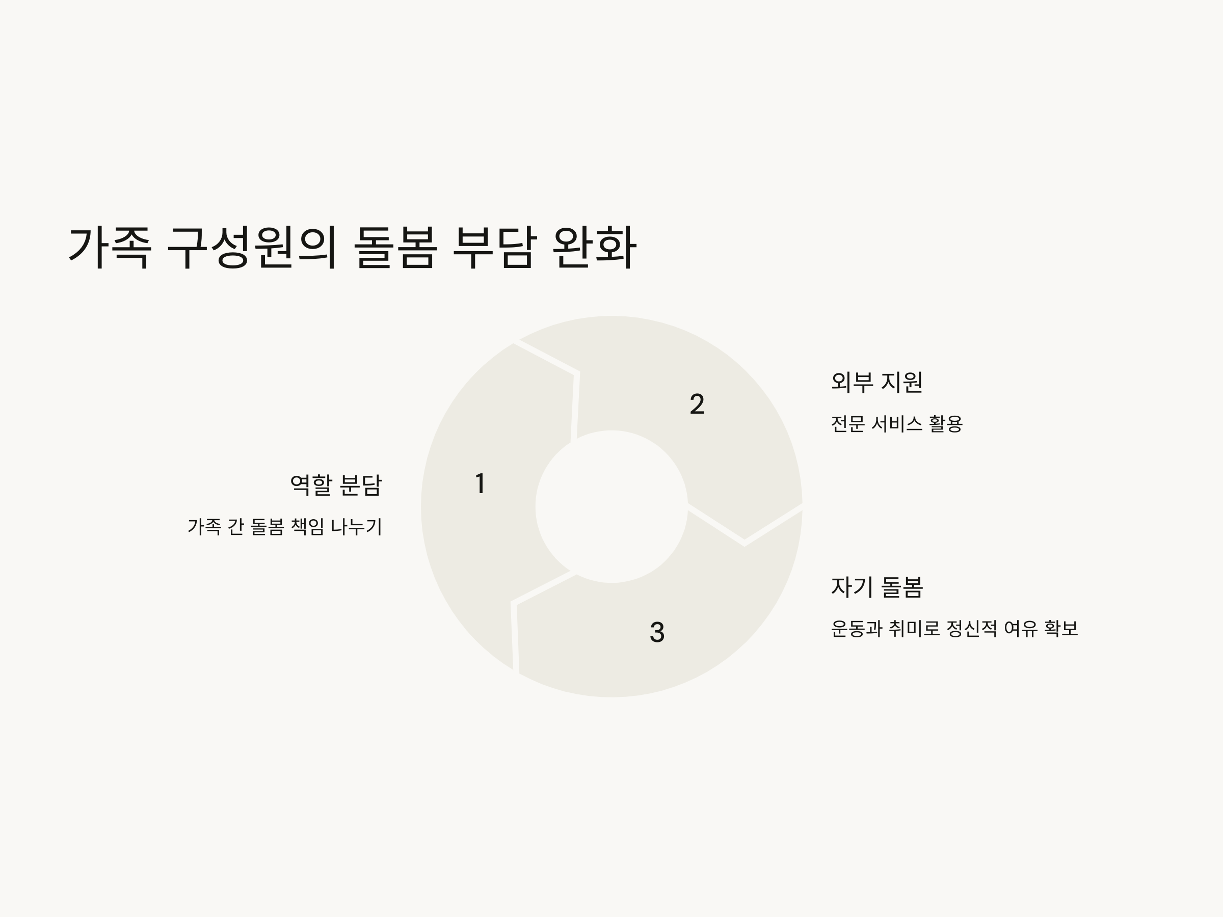환자를 돌보는 가족 역시 지속적인 신체적, 정신적 부담을 겪을 수 있습니다. 따라서 보호자의 건강 관리와 스트레스 해소 방법도 중요합니다. 가족 간 역할 분담을 통해 한 사람에게 부담이 집중되지 않도록 하고, 외부 지원을 활용하여 돌봄의 부담을 줄이는 것이 필요합니다. 또한, 자기 돌봄 시간을 확보하여 규칙적인 운동이나 취미 활동으로 정신적 여유를 갖는 것이 중요합니다.