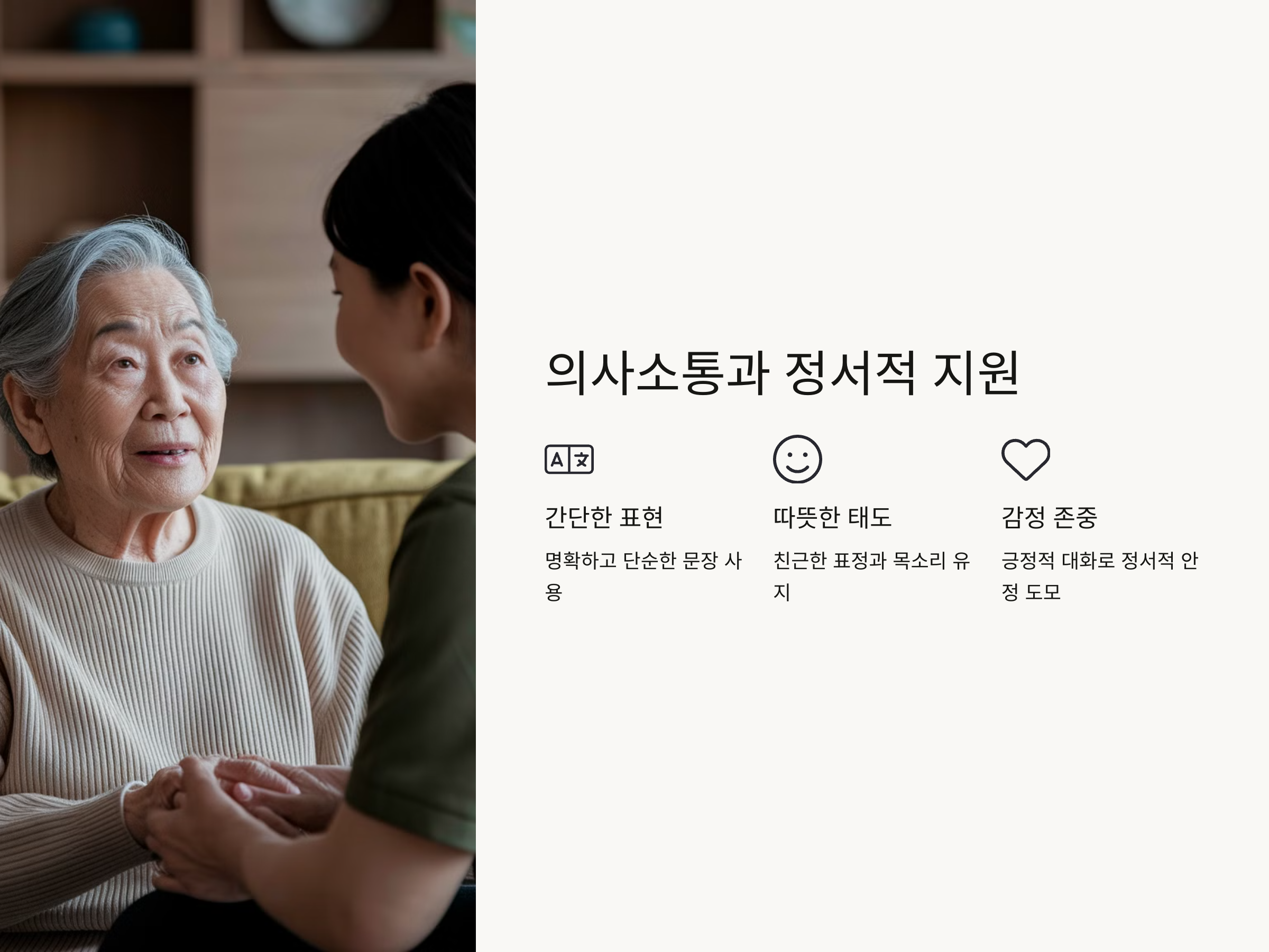 알츠하이머 환자와의 의사소통은 점점 어려워질 수 있습니다. 간단하고 명확한 문장을 사용하고, 따뜻한 목소리와 친근한 표정을 유지하며, 환자가 이해할 시간을 충분히 제공하는 것이 중요합니다. 또한, 환자의 감정을 존중하고, 긍정적인 대화를 통해 정서적 안정을 도모해야 합니다.