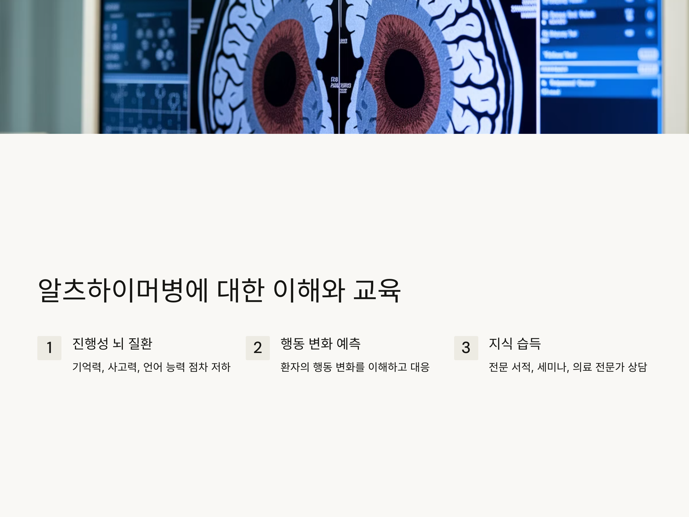 알츠하이머병은 진행성 뇌 질환으로, 시간이 지남에 따라 기억력, 사고력, 언어 능력 등이 점차적으로 저하됩니다. 가족들은 이러한 질환의 특성을 이해하고, 환자의 행동 변화를 예측하며, 적절한 대응 방법을 배우는 것이 중요합니다. 이를 위해 전문 서적을 읽거나, 관련 세미나에 참석하거나, 의료 전문가와 상담하는 등의 노력을 기울여야 합니다.