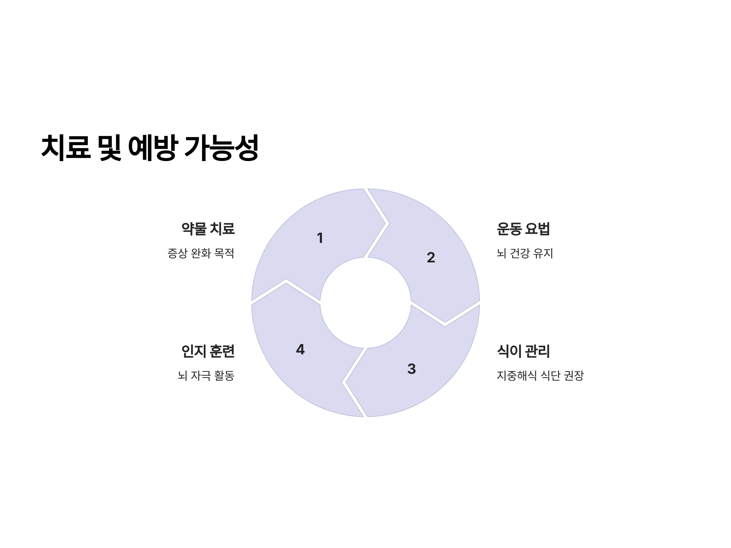 알츠하이머병은 현재 완치 방법이 없는 상태지만, 연구는 계속 진행되고 있습니다. 여러 연구에서 알츠하이머 후기 증상을 완화하거나 진행을 늦출 수 있는 다양한 치료 방법이 개발되고 있으며, 이를 통해 증상을 관리하는 방법도 늘어나고 있습니다. 치료법 중에서는 약물 치료뿐만 아니라, 운동, 식이 요법, 인지 훈련 등도 중요한 요소로 여겨지고 있습니다.