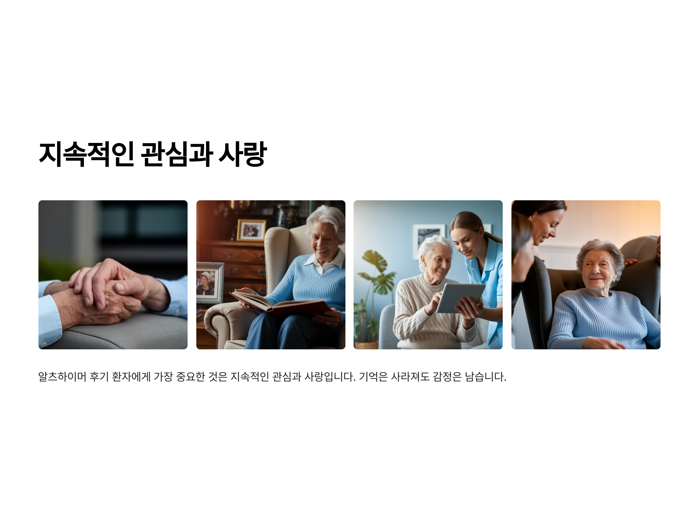 또한, 후기에 접어든 알츠하이머 환자는 자주 혼자 있을 수 없기 때문에, 24시간 돌봄 서비스나 가족의 도움을 받는 것이 필요할 수 있습니다. 이러한 돌봄은 환자가 자주 반복되는 행동을 하거나, 위험한 상황에 처할 때 빠르게 대응할 수 있게 해줍니다.