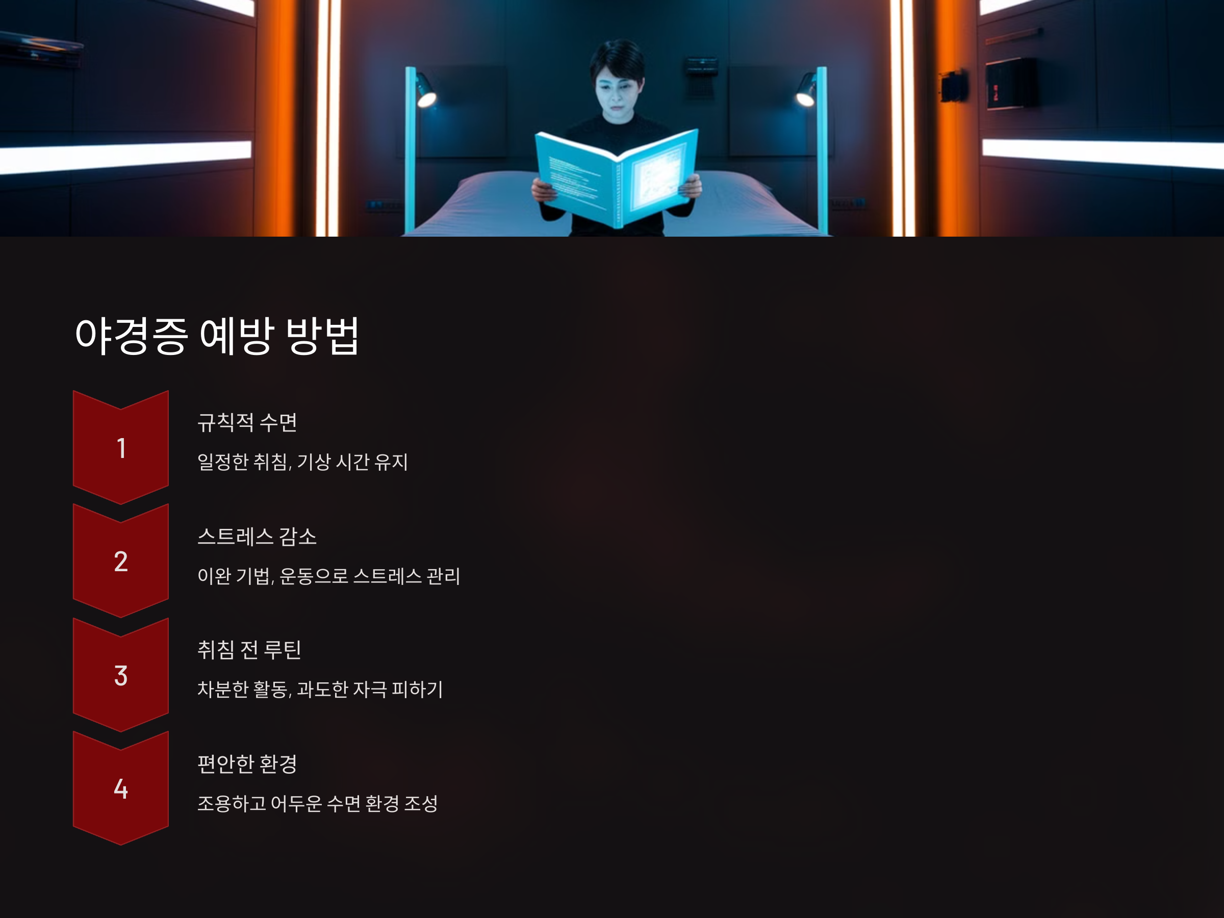 야경증을 예방하려면 규칙적인 수면 패턴을 유지하고, 스트레스를 최소화하는 것이 중요합니다. 아이들이 잠자기 전에는 차분한 활동을 하게 하고, 너무 많은 자극을 주지 않도록 해야 합니다.