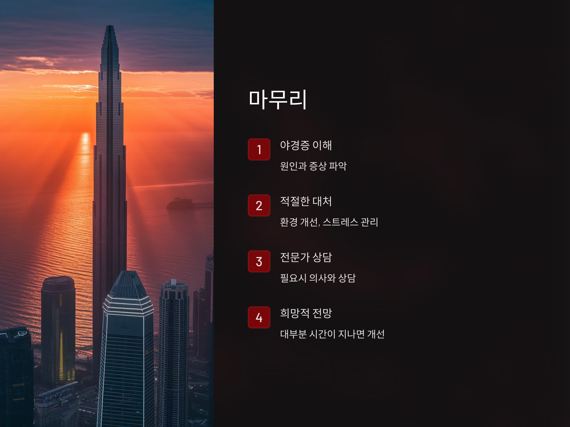 야경증은 예기치 않은 공포로 인해 수면의 질을 떨어뜨리고, 주변 사람들에게도 영향을 미칠 수 있는 수면 장애입니다. 이를 극복하기 위해서는 충분한 수면과 스트레스 관리, 그리고 필요할 경우 전문가의 도움을 받는 것이 중요합니다. 야경증은 많은 경우 시간이 지나면서 자연스럽게 해결되지만, 증상이 심각하거나 지속되면 적극적인 치료가 필요할 수 있습니다.