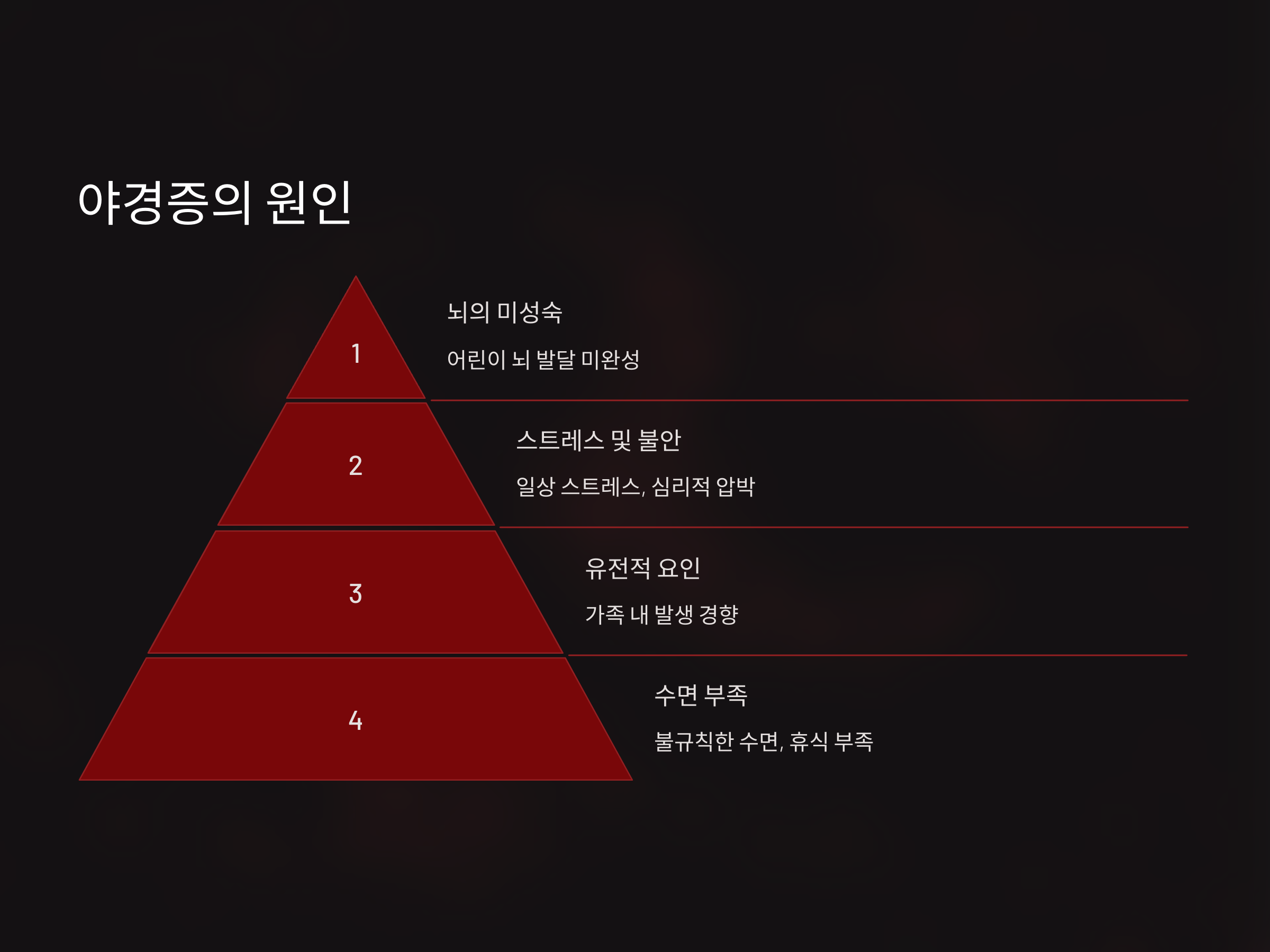 야경증의 정확한 원인은 아직 완전히 밝혀지지 않았지만, 몇 가지 가능성 있는 원인들이 있습니다. 특히 어린이들의 경우 뇌 발달이 아직 완전하지 않아서 이러한 증상이 나타날 수 있습니다. 이들은 아직 자아가 확립되지 않은 상태로 수면 중 자신이 꿈을 꾸는 것과 현실을 구분하지 못할 수 있습니다. 또한, 심리적인 스트레스나 불안이 그 원인으로 작용할 수도 있습니다.