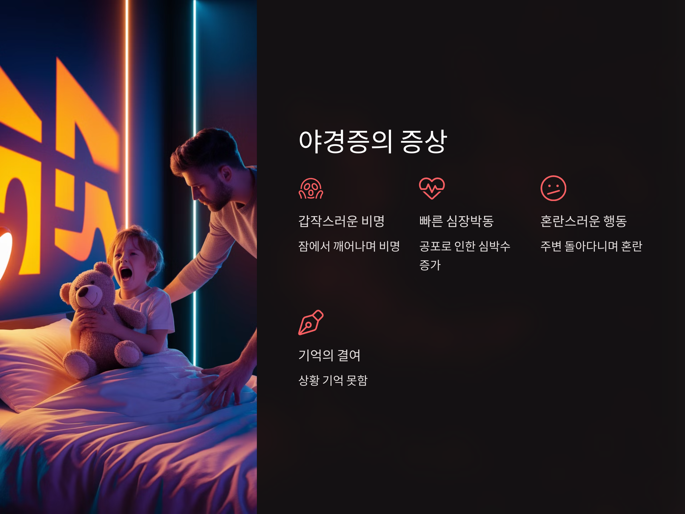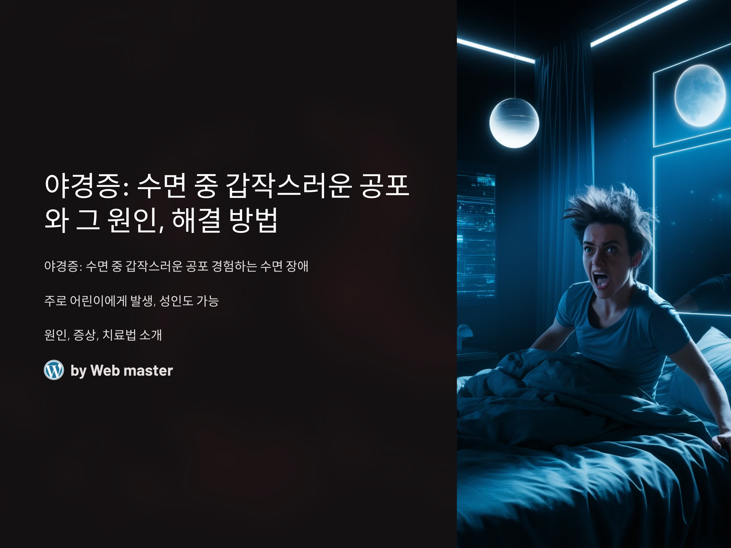 야경증(Night Terror)은 수면 중 갑작스러운 공포를 경험하는 수면 장애로, 일반적으로 빠른 눈 움직임(REM) 수면 단계에 해당하는 '비정상적인 각성'과 관련이 있습니다. 주로 어린이에게 발생하지만 성인에게도 나타날 수 있으며, 심각한 수면 문제로 이어질 수 있습니다. 수면 중 급작스럽게 일어나 혼란스러운 상태에서 공포를 느끼는 것이 특징입니다. 이 글에서는 야경증의 원인, 증상, 치료 방법을 소개하여, 이를 겪고 있는 분들이 해결책을 찾을 수 있도록 돕겠습니다.