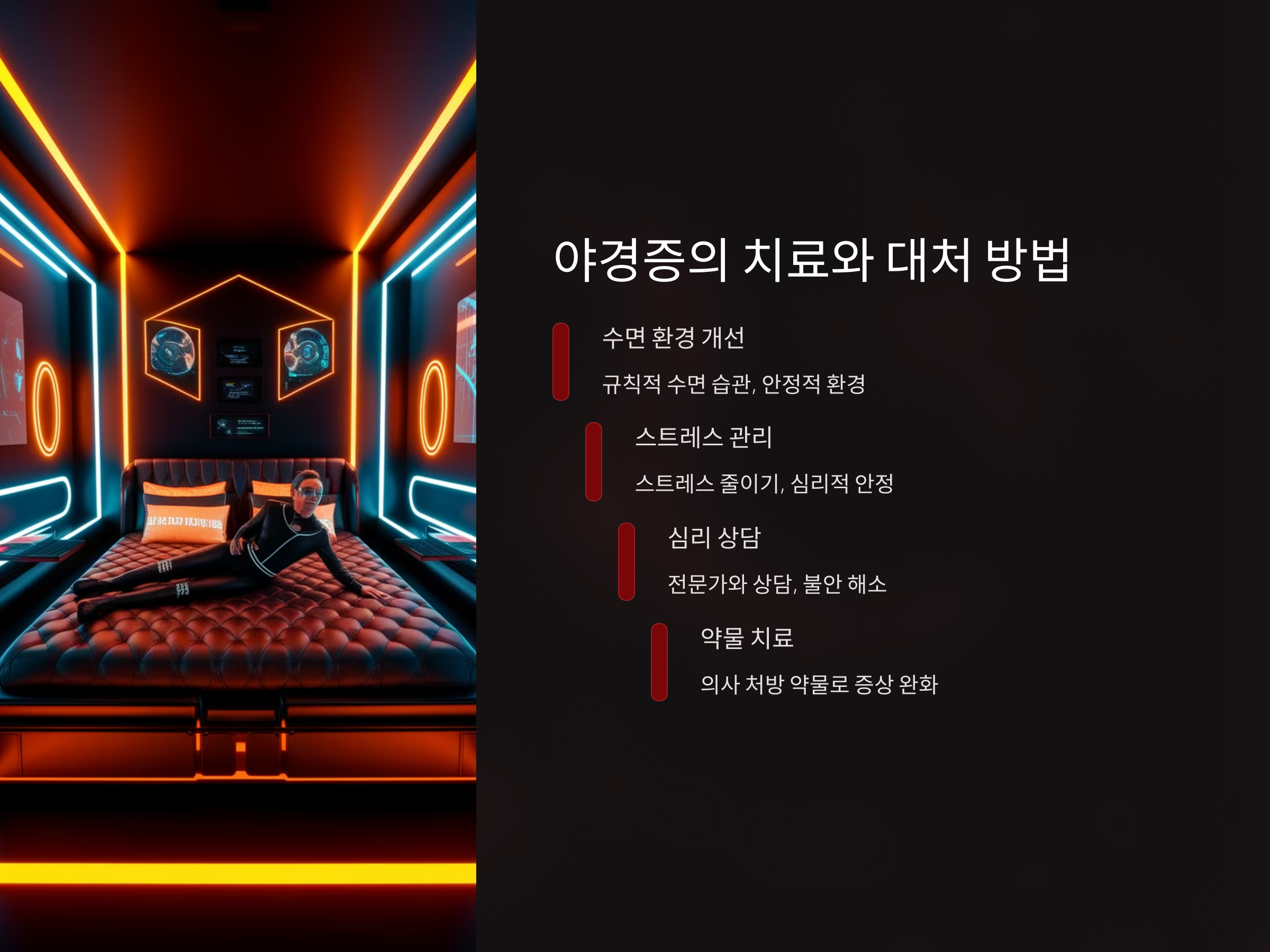 야경증은 대부분 시간이 지나면서 자연스럽게 개선되지만, 심각한 경우에는 치료가 필요할 수 있습니다. 이 증상을 관리하는 방법은 다음과 같습니다: