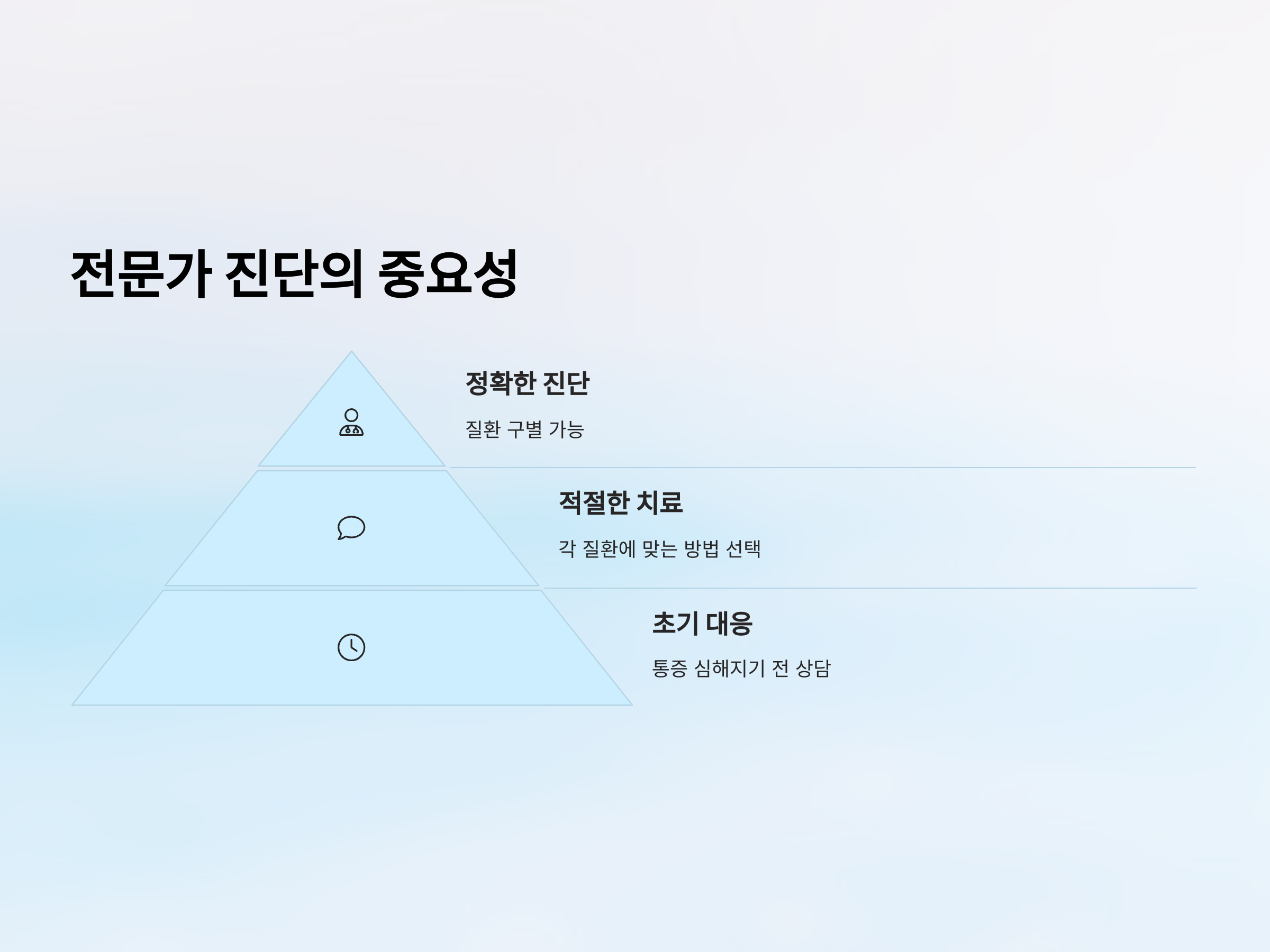어깨 통증이 지속되거나 심해지면, 자가 진단보다는 전문가의 진단을 받는 것이 중요합니다. 정확한 진단을 통해 오십견인지 회전근개 파열인지 구별할 수 있으며, 각 질환에 맞는 적절한 치료 방법을 선택할 수 있습니다. 초기 치료가 중요한 만큼, 통증이 심해지기 전에 병원을 찾아 전문가의 상담을 받는 것이 좋습니다.
