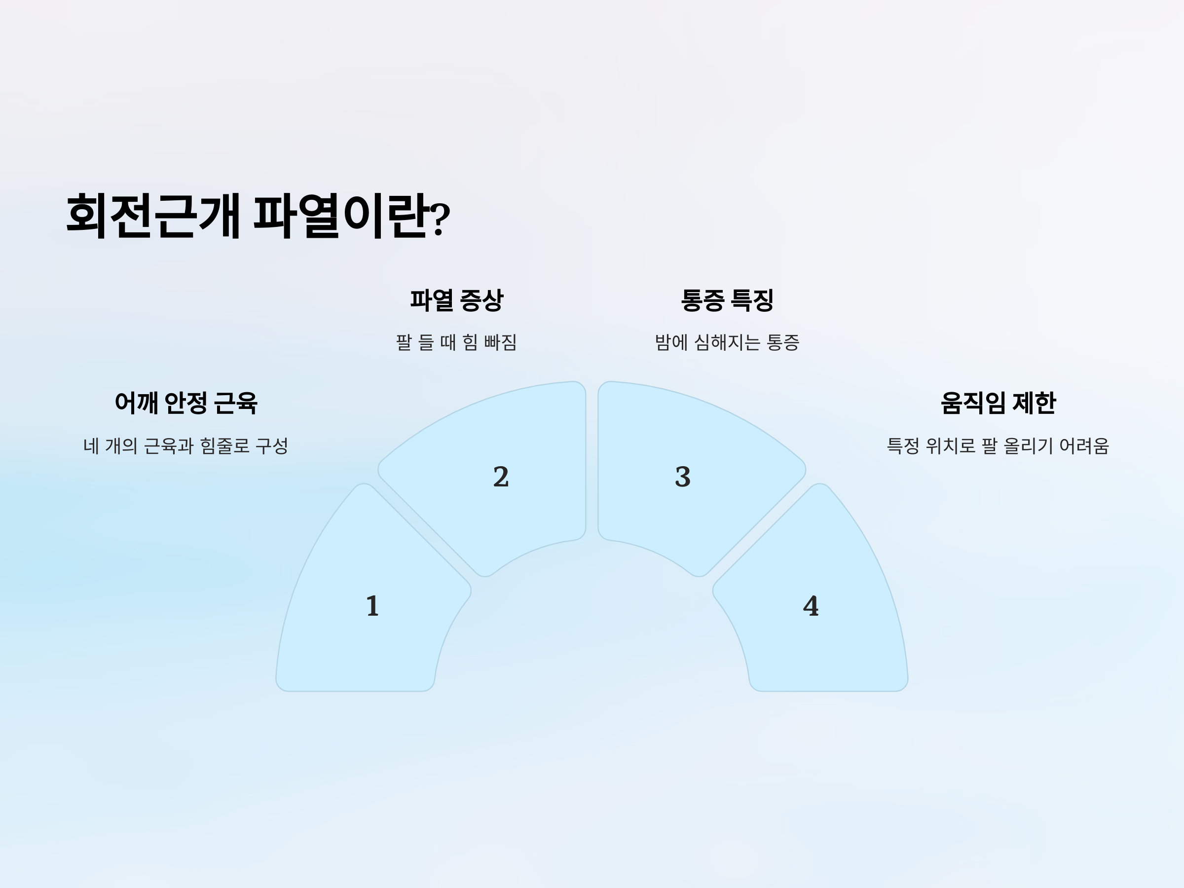 회전근개는 어깨 관절을 둘러싸고 있는 네 개의 근육과 힘줄로 구성된 중요한 부위입니다. 이 근육들은 어깨를 안정시키고, 팔을 회전시키는 역할을 합니다. 회전근개 파열은 이 근육 중 하나 또는 여러 개가 파열되거나 손상된 상태를 말합니다.