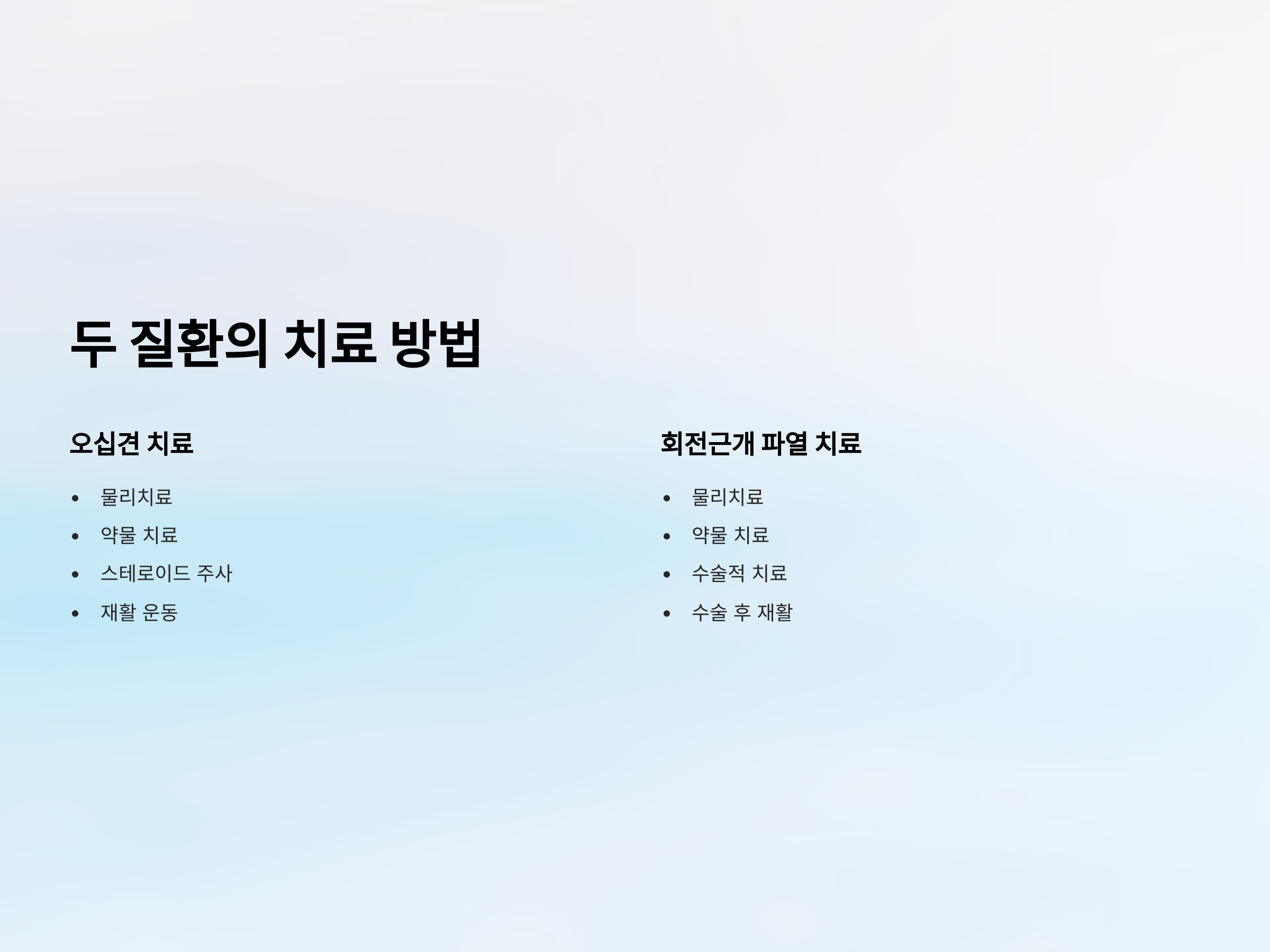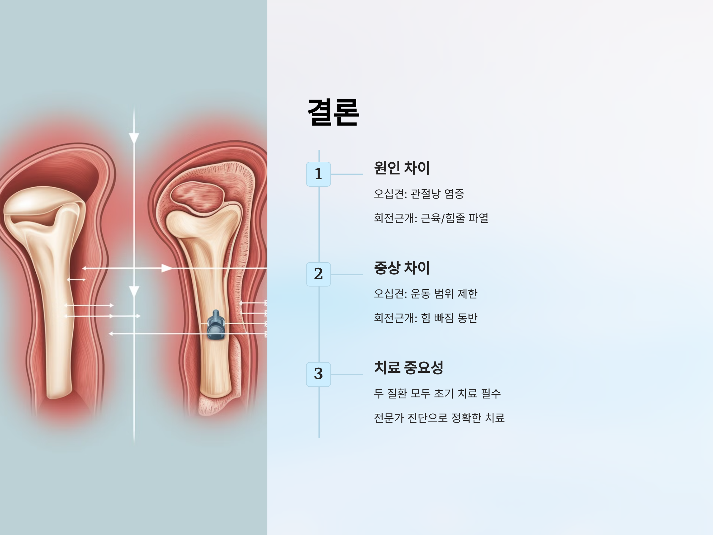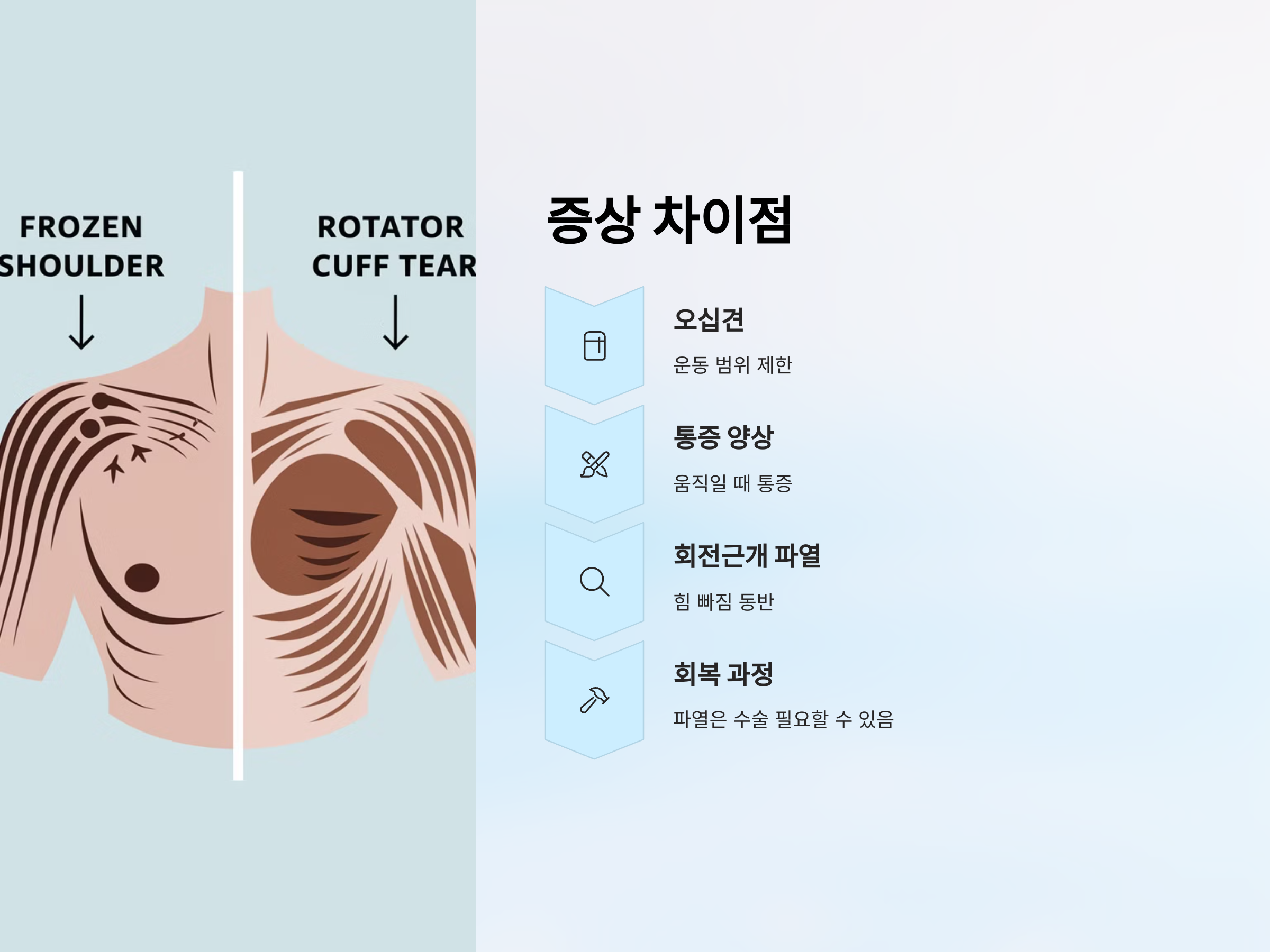 또한, 오십견은 주로 시간이 지나면서 점진적으로 회복되는 경우가 많고, 운동 범위를 회복하는 것이 치료의 핵심입니다. 반면, 회전근개 파열은 손상된 근육이나 힘줄을 수술로 복원해야 할 경우가 많습니다.