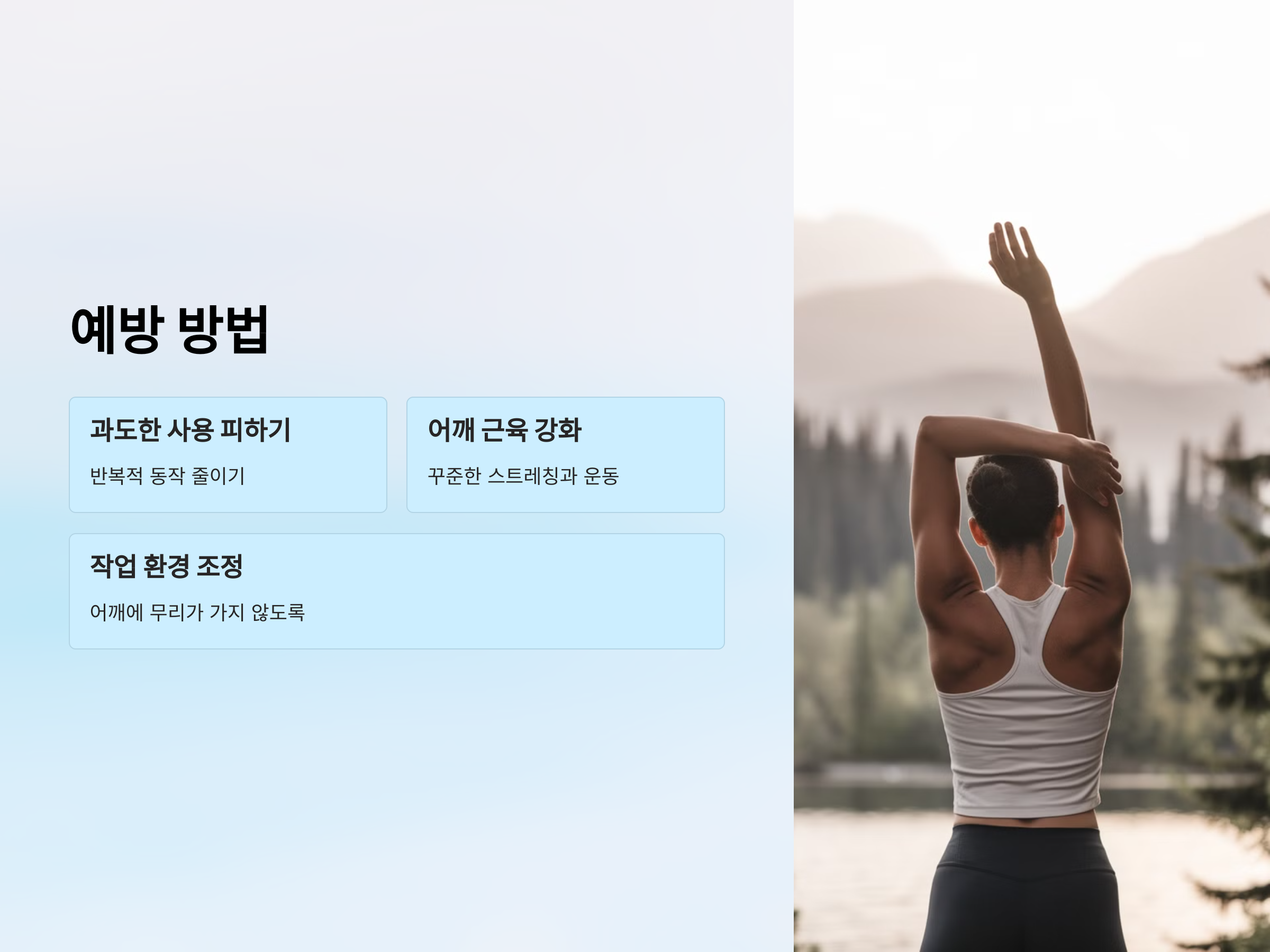 특히, 과도한 팔 사용이나 반복적인 동작을 피하는 것이 중요하며, 어깨에 무리가 가지 않도록 작업 환경을 조정하는 것도 좋은 예방책이 될 수 있습니다.