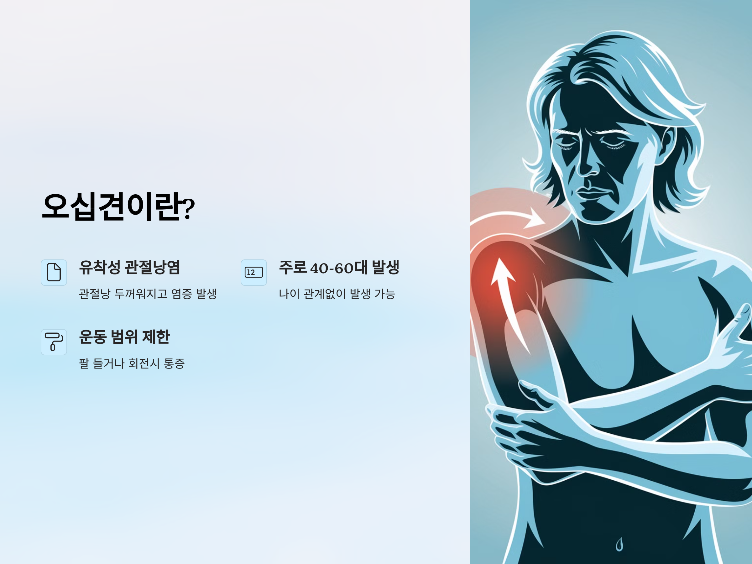 오십견은 의학적으로 '유착성 관절낭염'이라고도 불리며, 어깨 관절을 둘러싸고 있는 관절낭이 두꺼워지고, 염증이 생기면서 어깨의 운동 범위가 제한되는 질환입니다. 주로 40대 후반에서 60대 초반의 중년층에서 많이 발생하지만, 나이에 관계없이 발생할 수 있습니다.