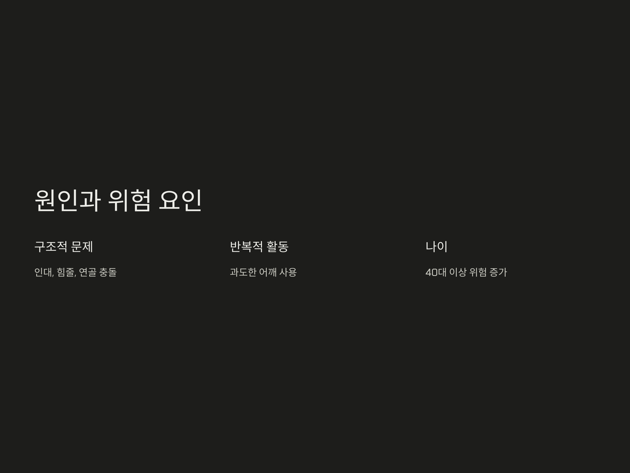 나이가 들면서 어깨의 연골과 힘줄이 약해지고 손상될 수 있습니다. 특히 40대 이상에서는 어깨 충돌 증후군이 발생할 확률이 높습니다. 이는 회전근개가 노화되면서 유연성이 떨어지고, 뼈와 조직 간의 마찰이 증가하기 때문입니다.