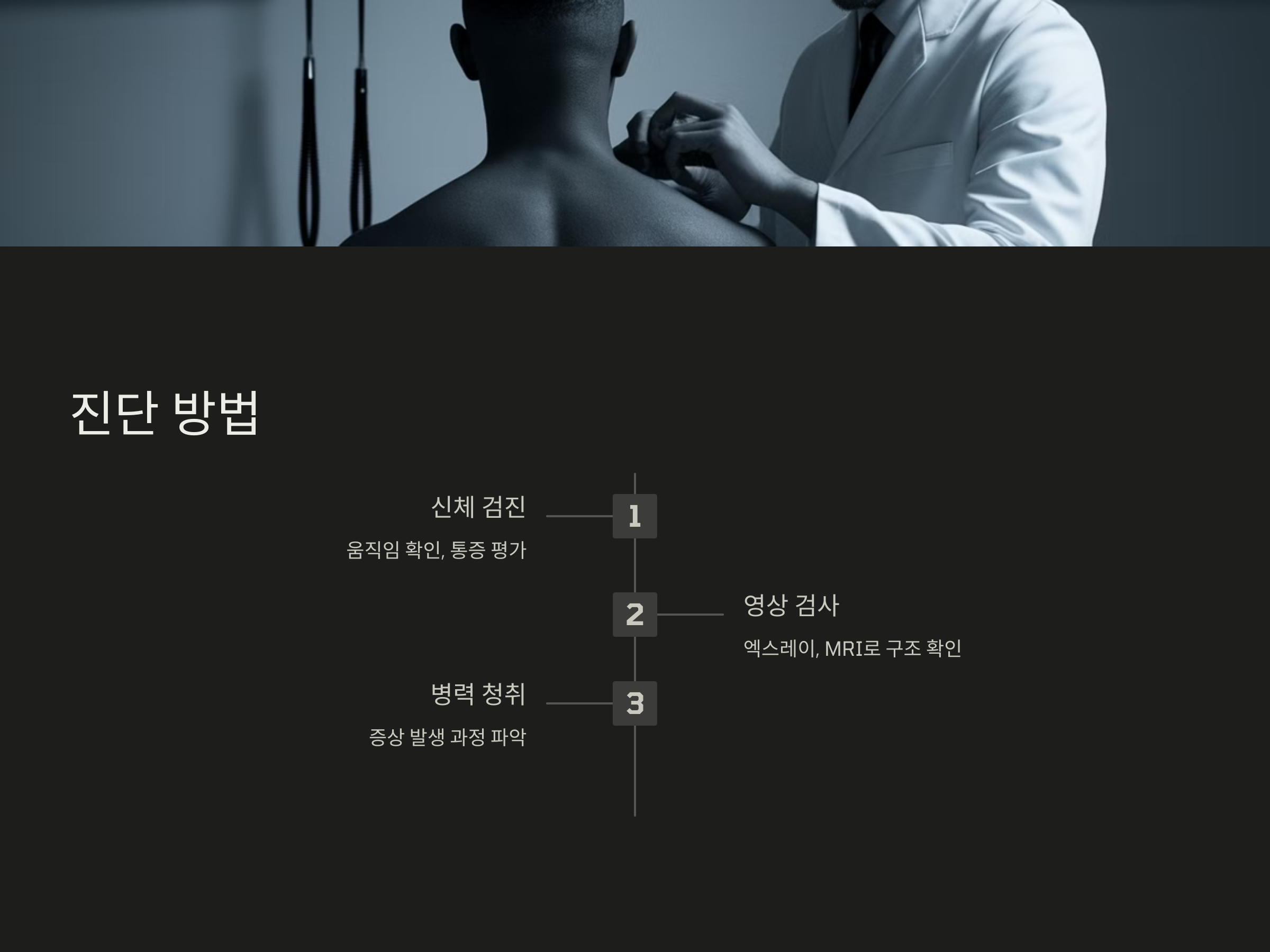 의사는 팔을 다양한 각도로 움직여 보며 어깨의 상태를 점검합니다. 이 과정에서 통증이 발생하거나 특정 움직임에서 문제가 생기면 어깨 충돌 증후군을 의심할 수 있습니다. 또한, 어깨의 강도나 유연성도 확인하여, 병의 심각도를 가늠할 수 있습니다.