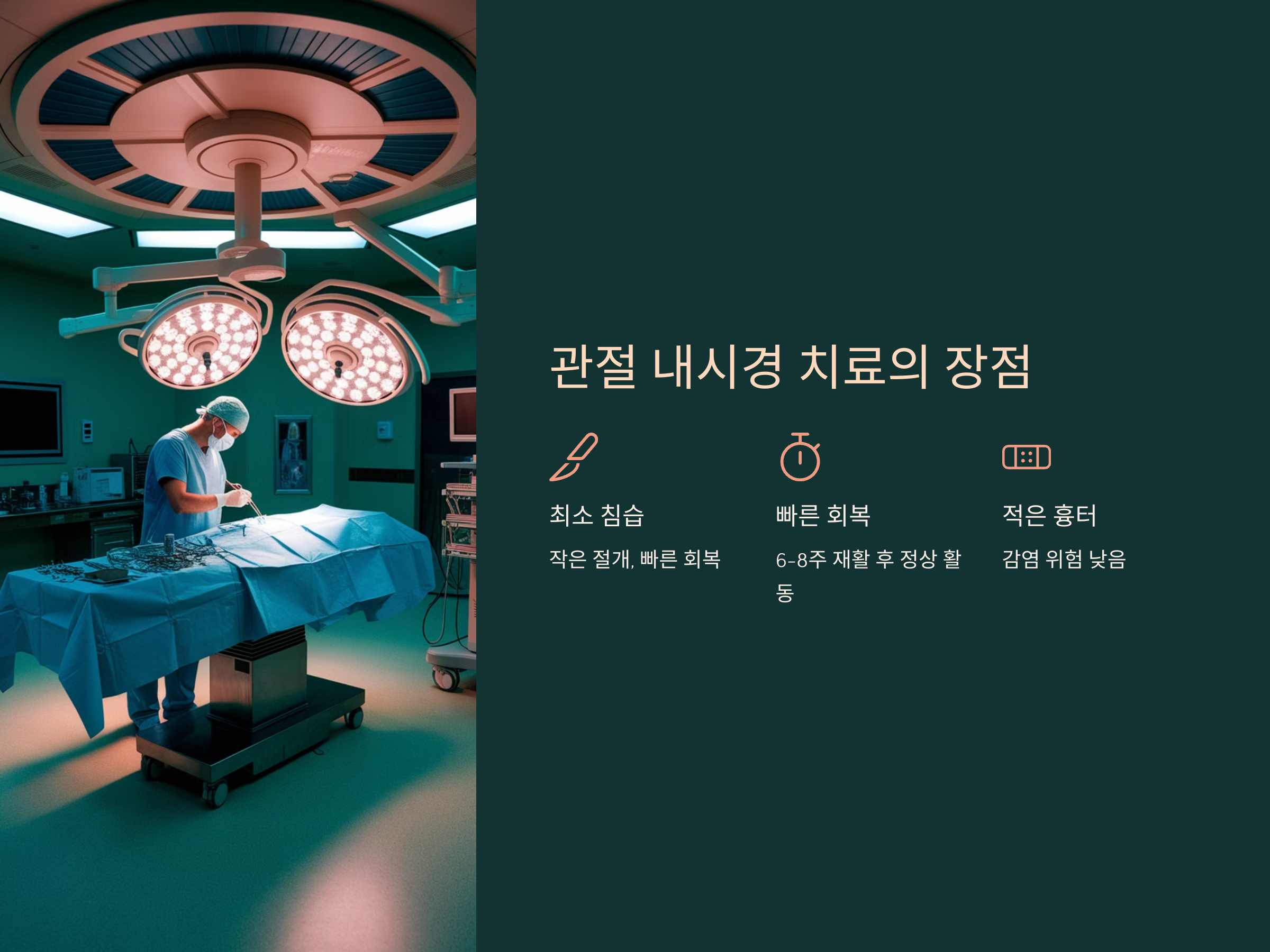 관절 내시경의 가장 큰 장점은 빠른 회복과 통증 관리입니다. 수술 후 통증이 적고, 입원 기간도 짧습니다. 또한, 수술을 진행하는 동안 주변 조직을 최소화하여 손상 부위에만 집중할 수 있기 때문에, 수술 후 회복 속도가 빨라집니다. 일반적으로 수술 후 6~8주 정도의 재활 기간을 거치면 정상적인 활동으로 복귀할 수 있습니다.