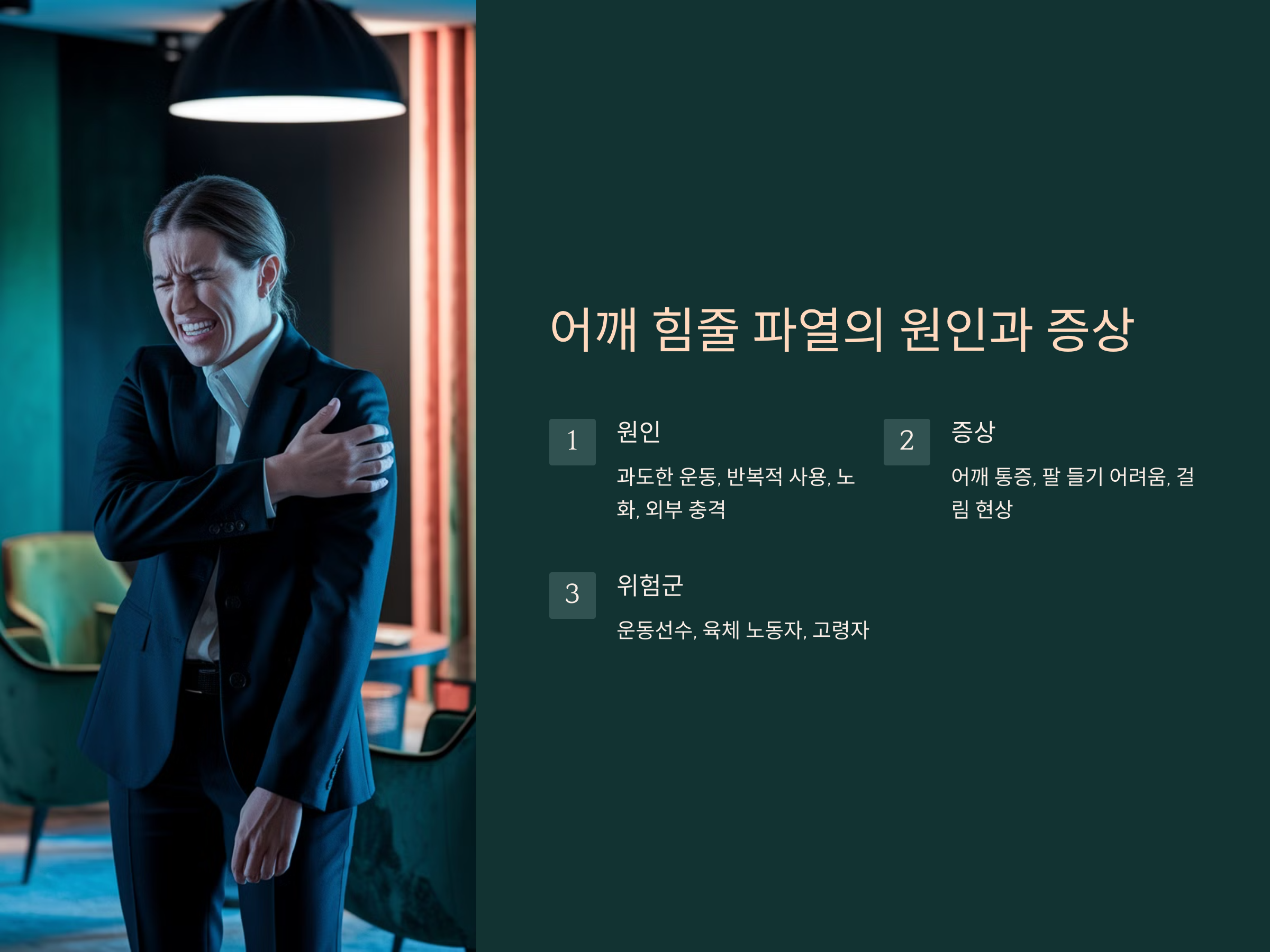 어깨 힘줄 파열의 대표적인 증상은 어깨 통증, 팔을 들어올리기 어려운 상태, 어깨에 걸림 현상 등입니다. 특히 팔을 들거나 회전할 때 통증이 심해지며, 일상적인 활동에 큰 지장을 초래합니다. 이러한 증상이 지속되면 관절 내시경이나 물리치료를 고려해야 합니다.