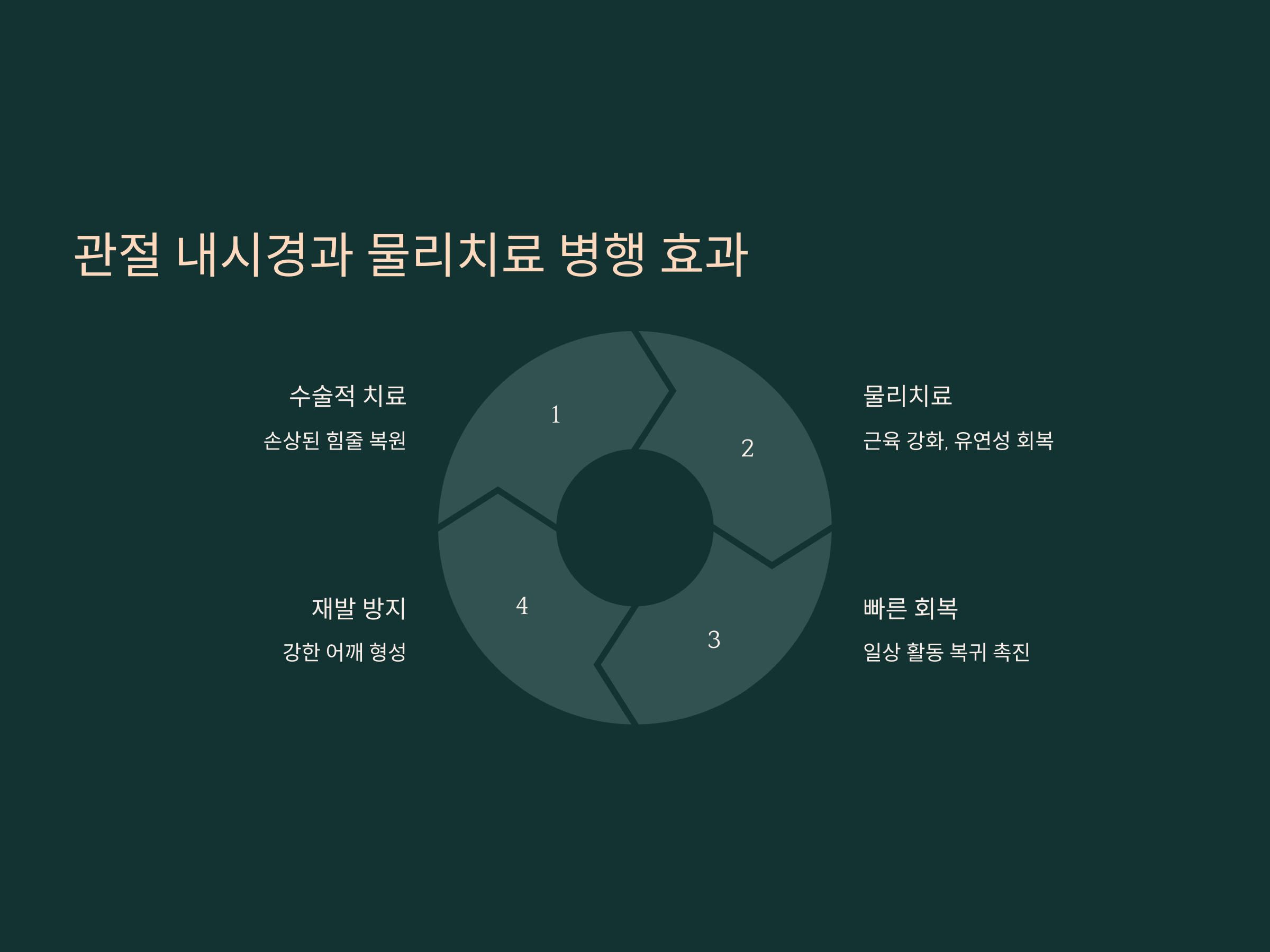 어깨 힘줄 파열의 치료에서 관절 내시경과 물리치료는 서로 보완적인 역할을 합니다. 관절 내시경을 통해 손상된 힘줄을 수술적으로 치료한 후, 물리치료를 통해 힘줄과 근육을 회복하는 것이 가장 이상적인 치료 방법입니다. 수술 후 물리치료는 강한 어깨를 만들고, 재발을 예방하며, 일상적인 활동에 빠르게 복귀할 수 있도록 돕습니다.